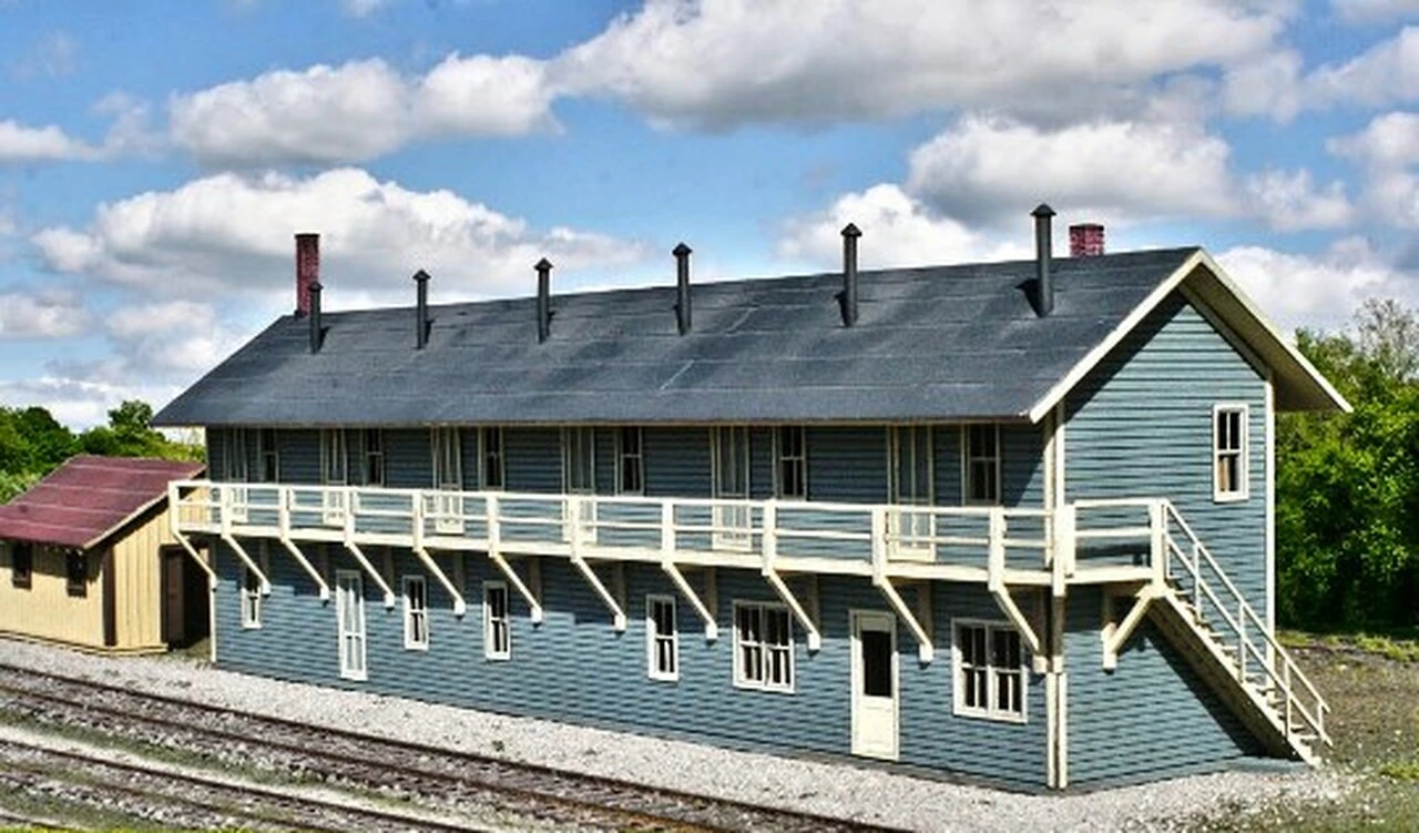 N Scale. Trackside or in your “layout town”, this wonderful two story building has space for railroad employee rooming, offices, even a beanery. And it’s narrow enough to fit between the tracks!!! 100% Laser-Cut, features include clapboard siding with pre-cut window & door openings, tabbed and slotted walls and roof parts, layered Peel & Stick windows and doors, a uniquely engineered balcony and outside staircase, plus two AMB cast metal “brick” chimneys and six smokejacks. This kit is quick and fun to build and a great addition to any layout. Assembled kit measures 6.25″ Long x 1.25″ Wide x 2″ High.