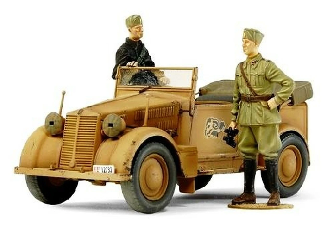 This plastic model is a joint effort by Tamiya-Italeri. The model is of the 508CM “Coloniale”. The 508CM “Coloniale’ was the military version of the 1,100cc Fiat 508C Balilla originally released in 1937. The Coloniale was notably used by the Italian Army in North Africa, for both the transportation of officers and reconnaissance activities. Following the Italian surrender in 1943, the Coloniale was commandeered and used in large numbers by the German forces. Can build with top up or down.