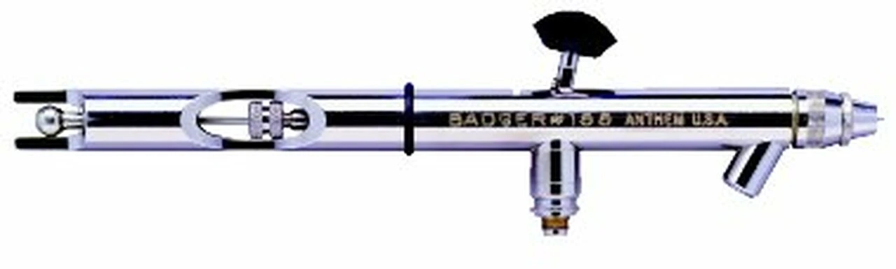 This set by Badger contains 155 Anthem air brush with all purpose nozzle / needle, attachable jar, additional jar with cover, 1/4 oz. color cup, trigger pad, protective cap, and instruction manual in a plastic case.