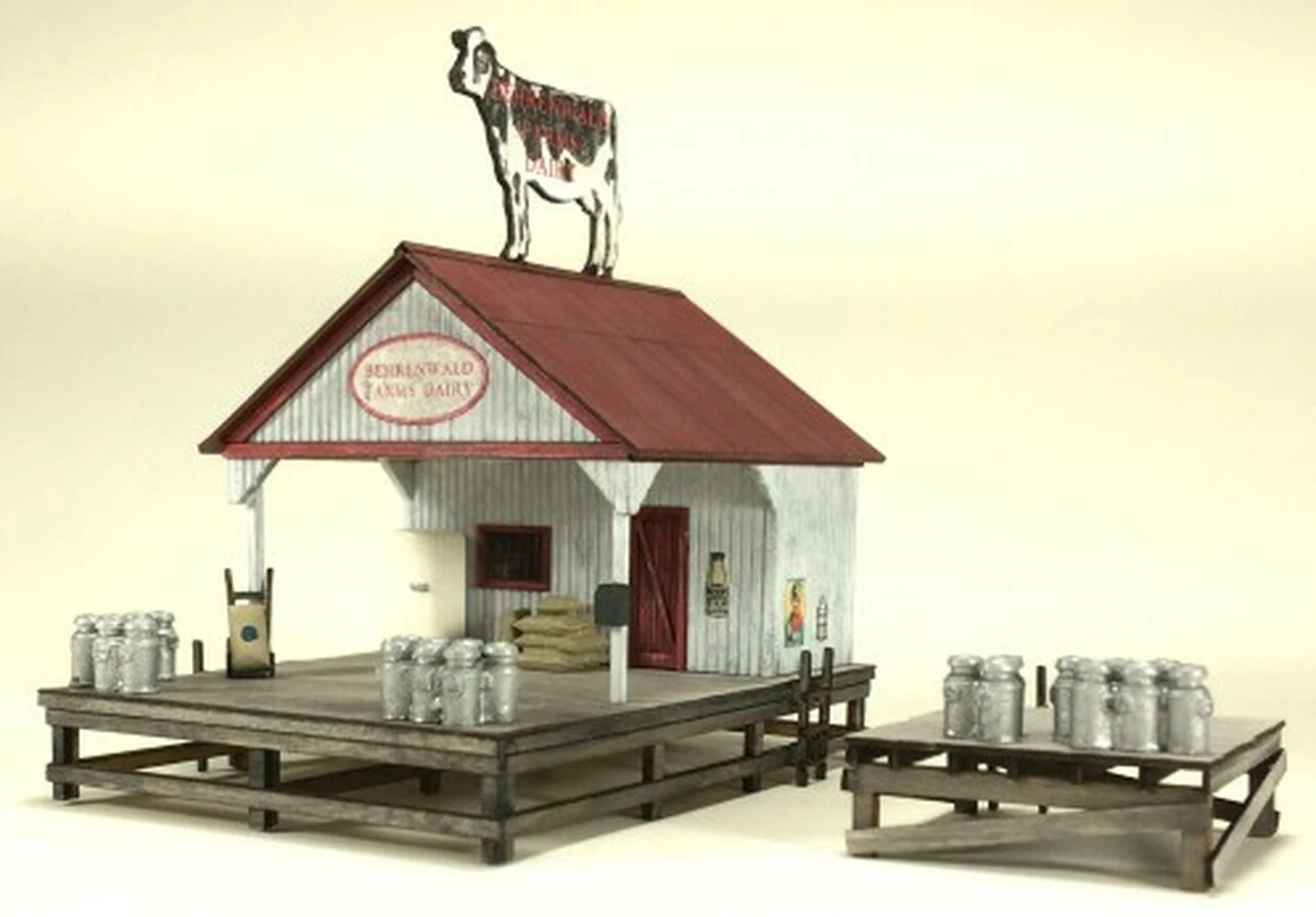 Precision cut from quality milled basswoods and 3-ply aircraft grade birch plywood, the Dairy Transfer Kit incorporates all the attributes customers are used to enjoying in an American Model Builders LASERkit: tab and slotted wall and roof assembly; peel and stick windows, doors, and trim; simulated metal roofing; both cracked and solid office window glazing; platform ladders; full color signage with large cow-shaped rooftop billboard; and an assortment of resin cast parts depicting milk cans, salt sacks, a hand truck, an other details for accessorizing the larger platform/office structure. The finish structures measure 1.375 inch square x 0.5 inch tall and 2.625 inch long x 3.5 inch deep x 2.75 inch high to peek of roof respectively.