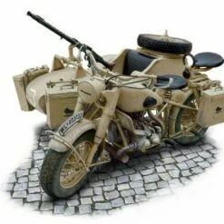 In 1938, based on a specific request of the German Army, BMW and Zundapp received the brief to start a co-joint development project able to guarantee the highest number of common components to optimize maintenance activities and spare parts logistics. The prototypes were released in 1940 and the production started at the beginning of 1941. Its most peculiar feature of the motorcycle was a side-car wheel that was driven with an axle connected to the rear wheel. These were fitted with locking differentials and selectable gear ratios to optimize on- and off-road performance. The twin-cylinder engine was capable of delivering 26hp. The BMW R75 was able to reach a max speed of 95 km/h. It was widely used, proving its reliability and sturdiness in all the most important operating theaters and in all environmental conditions from North Africa to Russia.