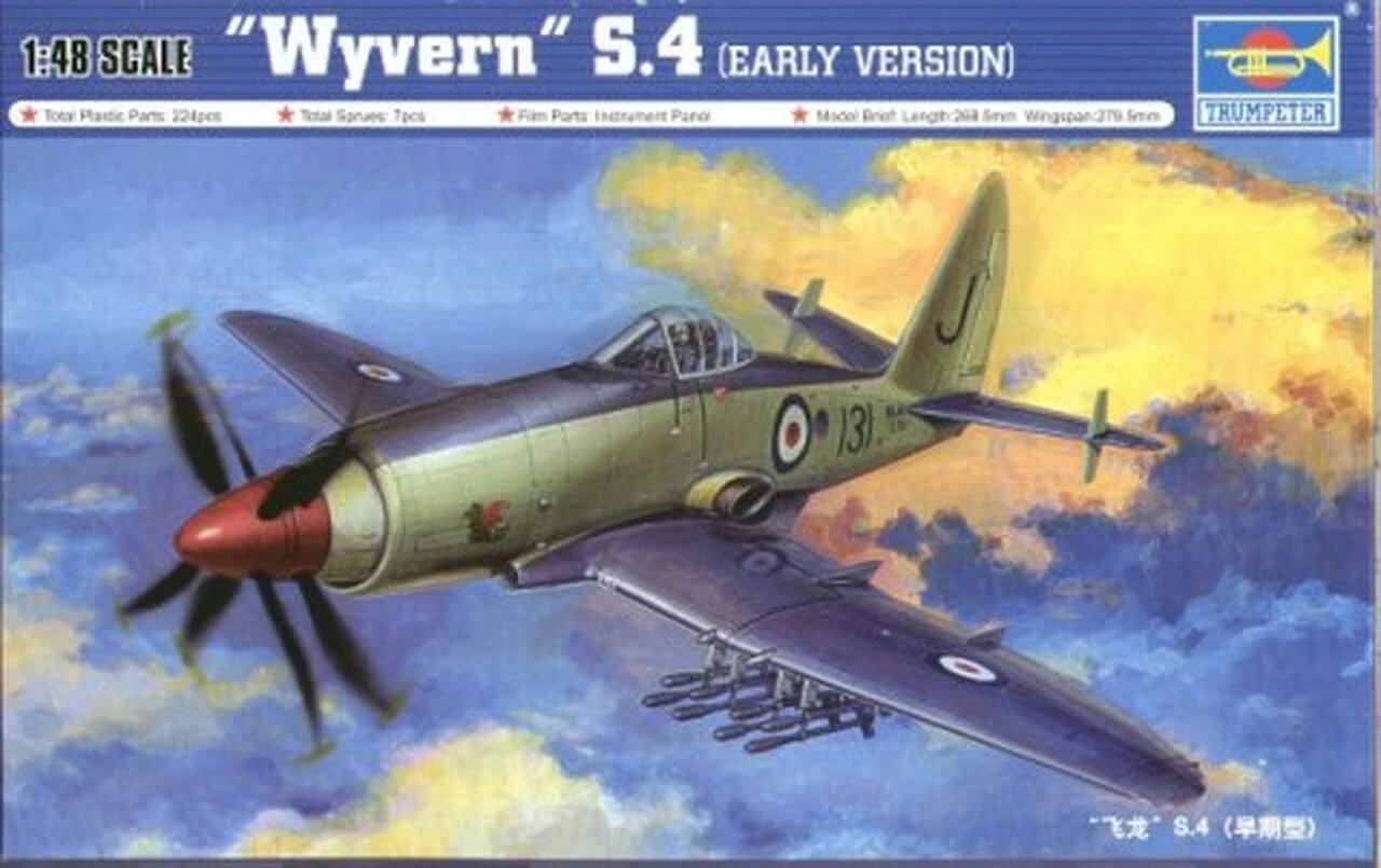 The wyvern was a mythical monster with the front legs of a dragon and the barbed tail of a snake. The Westland Wyvern was the last fixed-wing aircraft design from the Westland Aircraft Co. and was one of the last prop-driven fighters. It was a very large airplane that was about the same weight as a DC-3 but larger than—and twice as powerful as—a P-47 Thunderbolt. Its twin contra-rotating props certainly gave it the same mean appearance as its fictional predecessor. Four converted and 87 new-built aircraft were delivered of the most important Wyvern version, the TF.4, later renamed S.4. The TF.4 had numerous small changes. The recognition characteristic was the cut-off engine inlet, the propeller spinner then protruding much further forward. Small rectangular fins were added to the tailplane, changes were made to the ailerons, Martin-Baker Mk. 2B ejection seats were installed, and the cockpit was reinforced. Later modifications included perforated dive brakes, a flat windscreen, and provisions for tip tanks. Wyvern units were 827, 813, 830 and 831. In November 1956 the 830 and 831 Squadron took part in the Suez campaign.