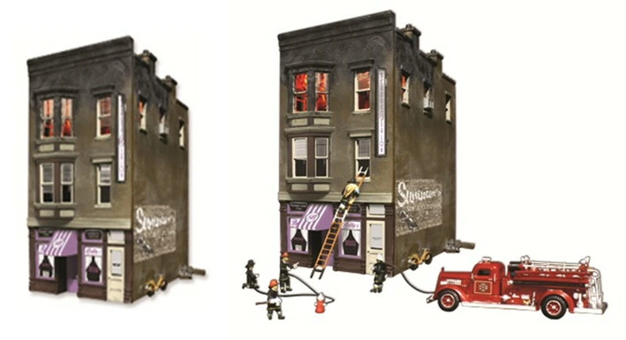 Set Built-&-Ready Structures on your layout right out of the box! Betty’s is a great building to use at the center of an action-packed layout scene. This three-story brick building includes flickering lighting effects that effectively create the illusion of an actively burning building. Custom painting and weathering add the finished touch of a scorched look. There are loads of details and scene-setting accessories, such as signage, a bicycle leaning up against the side of the building, dumpster, wrought iron fire escapes, window treatments and lots more! In addition to flickering light effects, the building includes an exterior LED light at the front entrance.