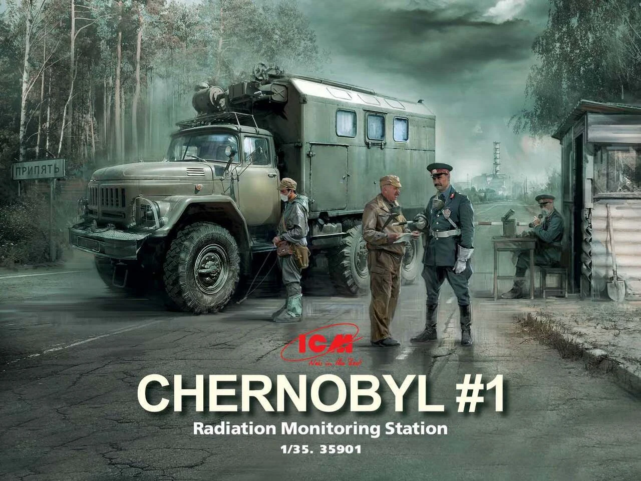 This 1/35 scale diorama collection is the first in the Chernobyl series created by ICM. This kit, the Radiation Monitoring Station, includes a ZiL-131KShM truck, five figures, and a diorama base with background.