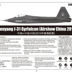 The Chinese J31, known as the Gyrfalcon or Falcon Hawk is a twinengine jet fighter put into service in 2012. Smaller than the Chengdu J20, the J31 more resembles the F35 with its two internal weapon bays. Kit consists of over 110 parts, including clear parts.