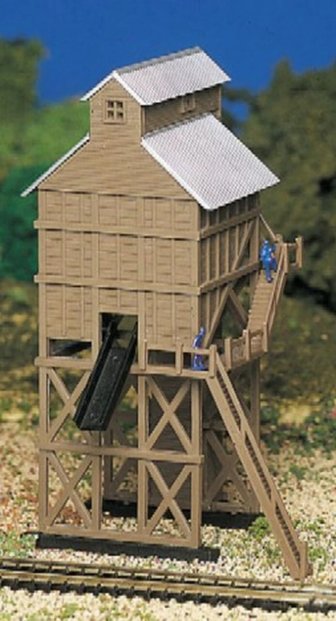 N Scale. Super detailed, hand-decorated, completely assembled model. Ready-to-use on any N scale model. Plastic construction. Coaling Station has several flights of very steep stairs, which feature two figures on them. Station is all brown with a silver tin roof and black coal chutes.