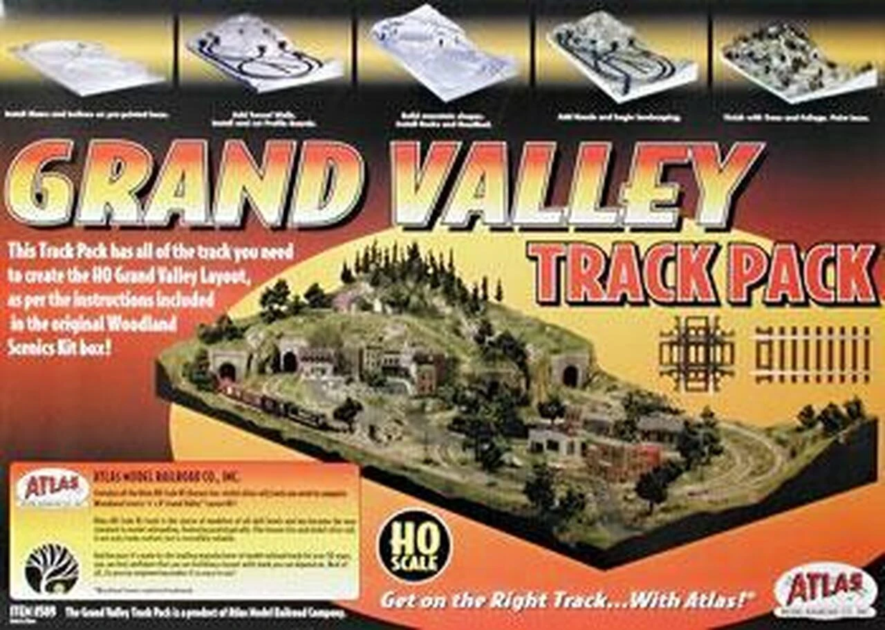 HO Scale Grand Valley Track Pack Layout. Features: Contains all the Atlas HO Code 83 (brown ties-nickel silver rail) track needed to complete Woodland Scenics 4′ x 8′ Grand Valley layout kit. Code 83 track is for all skill levels. Track is realistic and reliable. Atlas HO Code 83 items included -Eleven 9″ straight -Five 6″ straight -Three 3″ straight -Six 2″ straight -One 1-1/2″ straight -One 1-1/4″ straight -One 1″ straight -Thirty four 18″ radius -Two 1/2 18″ radius -Three 1/3 18″ radius -One snap-switch-left, manual -One snap-switch-right, manual -One 90 degree crossing -One 60 degree crossing -One Warren Truss bridge -Two bumpers -One terminal joine