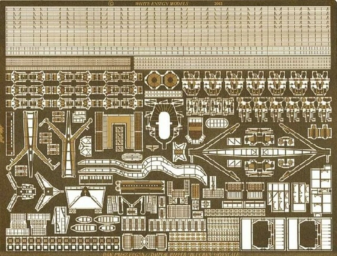 WEM 1/400 Prinz Eugen/Admiral Hipper (PE 4003) Designed for the Heller kits. Fits out one model. Contains:Standard & Stanchioned 3 Bar Railings, Vertical Ladder (Stock), Anchor Cable, Single 40mm Bofors, 40mm Bofors Turret Top Footplates, 40mm Bofors Footplate Railings, 20mm Flakveirling, Half Height Railings, Bulwark Handrails, Single 20mm C30, 3.7mm Doppelflak, Bridge Window Plate, Crane Jib (Prinz Eugen), Hose Reels, Turmmast Forward Yard Footbars, Arado 196 Seaplane Parts, Superstructure Elevation Stop Rails, Funnel Base Vent Grills ( Hipper/Blcher), Funnel Base Catwalk (Hipper/Blcher), FuMb4 (Sumatra) Antenna, Mast Top Yards & Footropes, Stern Crest, Funnel Platform & Supports (Hipper/Blcher), Seaplane Launch Cradle, Catapult Access Plaform, Funnel Cap Grill, Crane Jib (Hipper/Blcher), Crane Base (Hipper/Blcher), Foremast Braces, Boat Davit Winch Drum, Bridge Wings (Hipper/ Blcher), Mainmast Lower Platform (Late Prinz Eugen), Mainmast Platform, Turmmast Aft Yards & Footbars, Battle Bridge Windows, Main Mast Upper Platform, Seaplane Catapult, Retractable Bridge Wings (Prinz Eugen), Inclined Ladder (6mm), FuMo26 Radar Antenna (Late), FuMo26 Radar Antenna (Early), FuMb7 (Timor) Antenna, Radar Antenna Mounting Frames, FuMo22 Radar Antenna, Aft Boat Cradle Catwalks (Hipper/Blcher), Circular Portholes with W/T Hatches, Port Forward Boat Cradles, Starboard Forward Boat Cradles, Aft Boat Cradles (Hipper/Blcher), FuMo22 Radar Antenna, Marx Floats, Small Open Boat Thwarts, Large Open Boat Thwarts, Long Inclined Ladders, FuMo23 Radar Antenna, Inclined Ladders (7mm), Deck Hatches, Watertight Doors, Rectangular Windows with Side Opening Hatches, Rectangular Windows with Top Opening Hatches, Whale Boat Davit Assemblies.