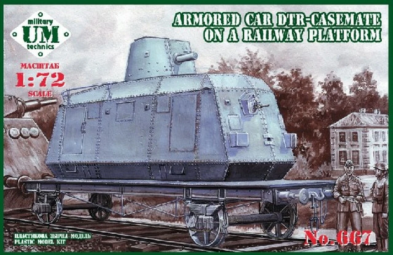 Armored car-carrier DTR-Casemate (riveted version) was developed in the USSR in 1934. DTR was designed to make a command and observation post for the units of armored trains, and also for reconnaissance and transportation by rail of wounded soldiers and special freights. DTR participated in World War II at the Soviet-German front and two of them were captured by the Wehrmacht in the battles of the summer 1941. One of them, as an armored car, was used as a part of the PZ-10 armored train, and the hull of the second captured machine the Germans had set on a railway platform as an armored casemate and used as a part of the armored train.