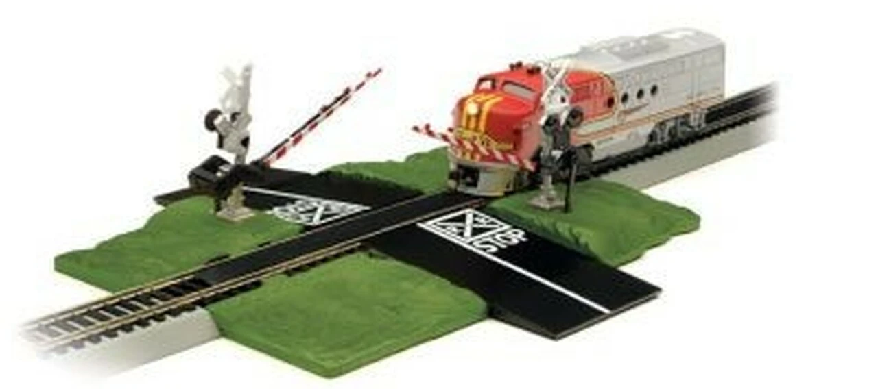 N Scale. For use with Bachmann E-Z Track and most other brands. Dual action…lower and raise automatically as train passes! This precision-built track accessory is authentic in every detail. No batteries & no wiring required! Realistically detailed railroad crossing signal poles and gates. Track section is molded within a terrain molded base. Nickel silver rail and black molded ties. Adapter pieces for the road help create a smooth incline from your layout up to the tracks.