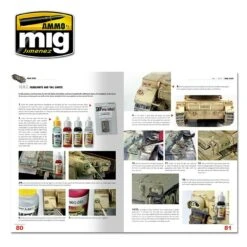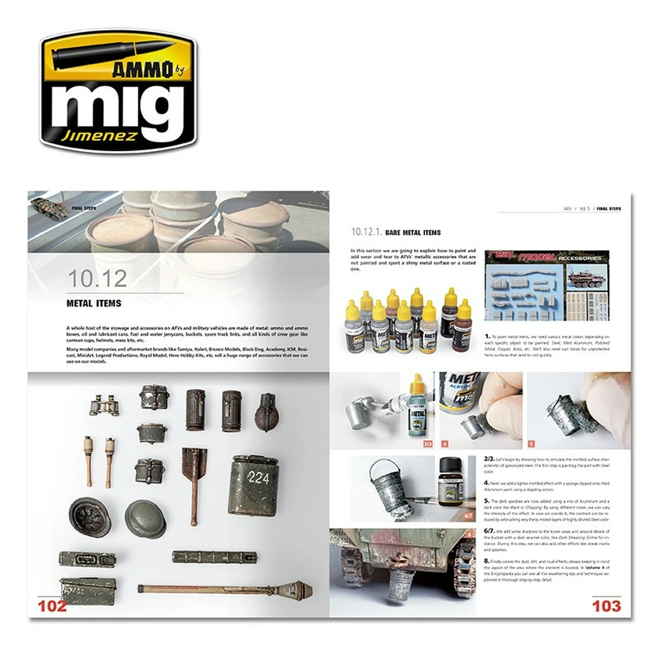 Volume No. 5 features in-depth explanations about how to tackle the painting and weathering process of tracks, car and truck wheels, exhaust pipes, tools, tow cables, personal weapons and machine guns, antennas, as well as clear parts for periscopes and sights. The modeler will also learn how to paint and weather all kinds of wooden items such as ammunition and supplies boxes; pieces of gear made of metal like water, fuel and oil cans, fabric elements such as canvas, flags, and mantlet covers. Finally, we will thoroughly cover natural elements like rocks, earth, fallen leaves, small branches, and grass. In addition, there is a gallery with pictures of the main models used in the encyclopedia and a chart with the most important techniques used for each example for quick reference.
