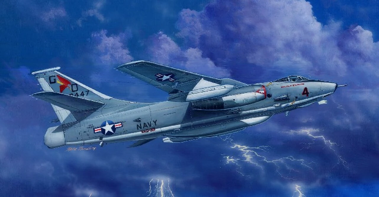 The Douglas A-3 Skywarrior was a strategic nuclear bomber developed for the US Navy. The aircraft had a largely conventional semi-monocoque fuselage with two J57 turbojet engines in underwing nacelles. The A-3’s wings can be folded for storage below deck. It sports a radar-controlled tail turret and a crew of three. The A-3 Skywarrior project started in 1947.The prototype XA3D-1 first flew in October 1952 and then entered service with the Navy Heavy Attack Squadron One in 1956. Production ended in 1961. In total Douglas built 282 Skywarriors.