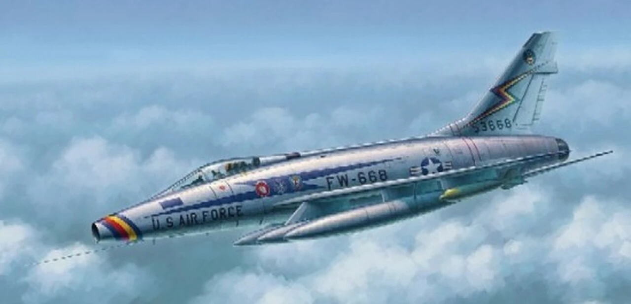 The F-100 was the USAF first supersonic fighter. It made its initial flight on May 25, 1953 and the first production aircraft was completed in October 1953. The Super Sabre became the first fighter to attain level flight supersonic speed, doing so during its maiden flight on Oct. 29, 1953. The F-100 became operational in Sept. 1954. North American built 2,294 F-100s before production ended in 1959. The F-100D was a version of the F-100 family with a number of improvements, including increased wing and vertical tail area, additional electronic equipment, autopilot, provision for “Buddy” tanker refueling equipment, two 450 gallon external tanks, and inboard landing flaps.