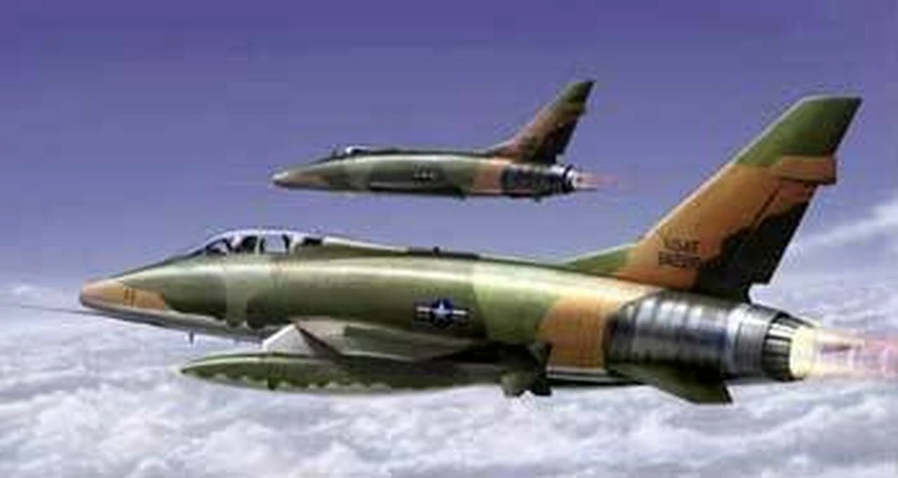 The F-100 was the USAF first supersonic fighter. It made its initial flight on May 25, 1953, and the first production aircraft was completed in October 1953. The Super Sabre became the first fighter to attain level flight supersonic speed, doing so during its maiden flight. The F-100 became operational in September 1954. North American built 2,294 F-100s before production ended in 1959. The F-100F two-seat trainer entered service in 1958. It maintained mostly the same weapons and airframe upgrades as the F-100D, including increased wing and vertical tail area, additional electronic equipment, autopilot, provision for “Buddy” tanker refueling equipment, two 450 gallon external tanks, and inboard landing flaps.