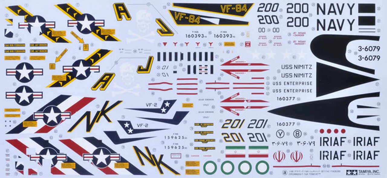 Comes with 3 marking options: 2 for high-visibility F-14As from the VF-84 (Jolly Rogers) and VF-2 (Bounty Hunters) U.S. Navy Fighter Squadrons, plus 1 Islamic Republic of Iran Air Force (IRIAF) unit F-14A