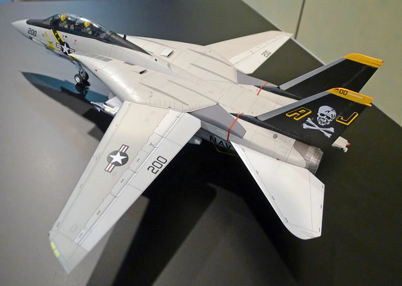This specific model kit depicts the F-14A Tomcat variant. The F-14A was the initial two-seat, twin-engine, all-weather interceptor fighter variant for the U.S. Navy. It first flew on December 21, 1970. As a U.S. Navy fighter it fulfilled the dual roles of long range interceptor and air superiority fighter, and later bomber. Deployed from 1974 to 2006, it successfully employed a “swing wing”, which offered variable sweep. The F-14A, which covers most of the early variants, was the most prolifically-produced variant of the Tomcat. 79 were exported to Iran before U.S.-Iranian relations began to deteriorate and later took part in the Iran-Iraq War.