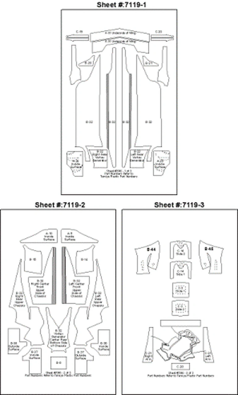 Designed for both Tamiya Ferrari F1/2000 kits #20048 & 20049. The set contains 1 sheet each of 1020 and 1024 Carbon Fiber Twill Weave Black on Pewter, plus 1 sheet of 1424 Plain Weave Carbon Fiber Black on Pewter. Templates are printed on the reverse side of the decal sheets so patterns appear in reverse direction.