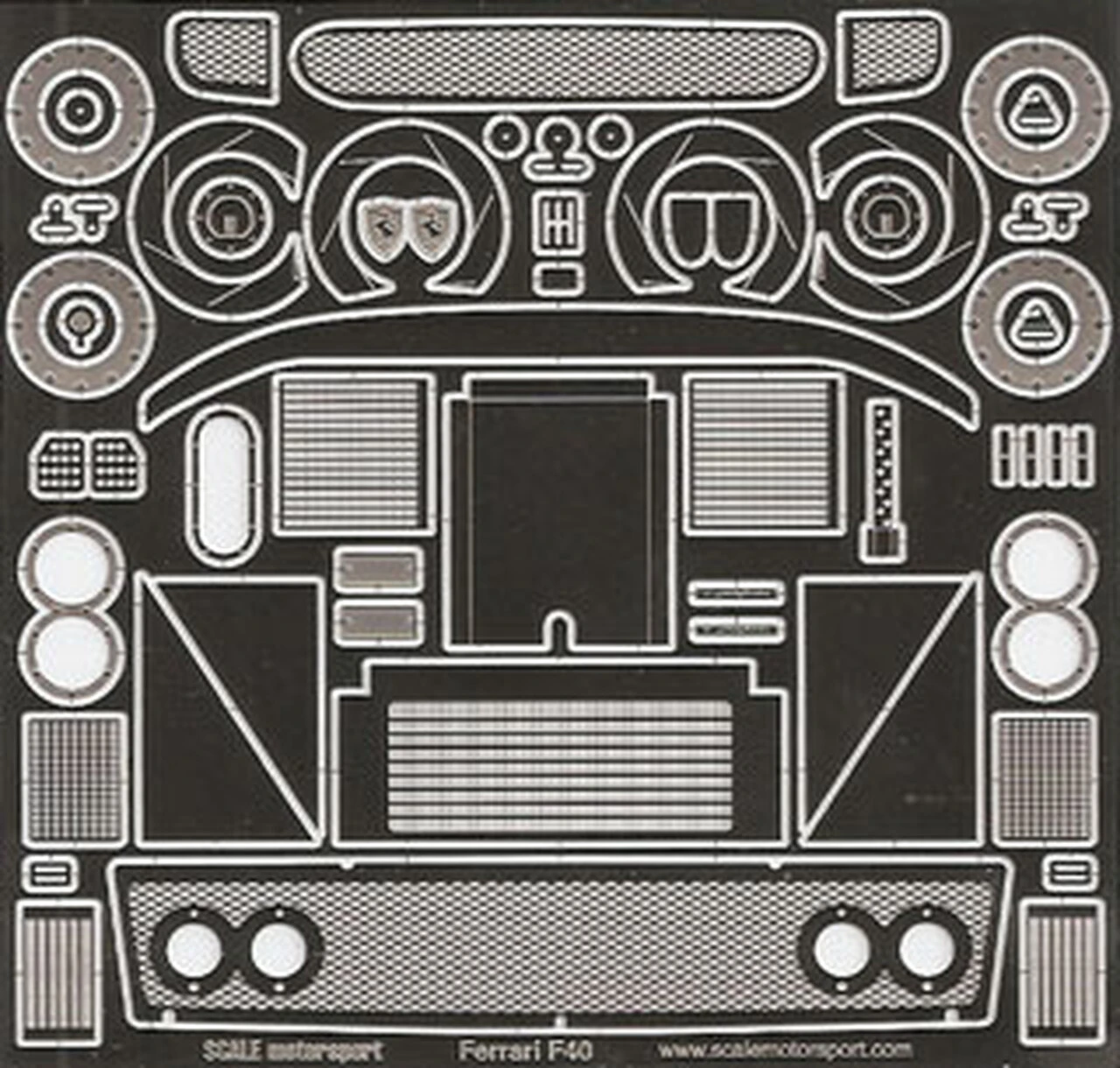 Designed for Tamiya Ferrari F40 Competizione Kit Tamiya Kit #24284. Kit includes: Hub Details, Seat Belts, Intake Mesh, Radiator Mesh, Brake Discs, Dry Brake, Fender Emblem, Shift Plate, Mirror Faces, Hood Badge, Splitter, Brake Pedal, Clutch Pedal, Exhaust Rim, Radiator Grill, Accelerator Pedal, Body Latches, Tail Light Rims, Undertray, Intercooler Face, Rear Body Mesh