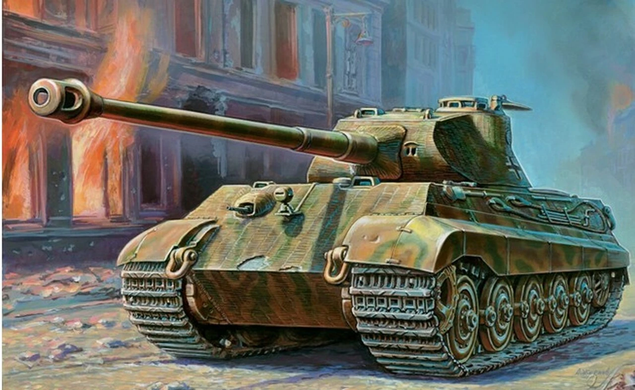 The King Tiger was the heaviest tank of WWII. With its powerful, long-barreled 88mm gun it was capable of destroying a Sherman tank from 3500 meters. They were issued to the army in February 1944 and were in combat by May, in battles near Minsk. Two companies of King Tigers were in the Battle of Normandy.