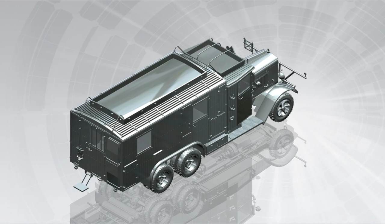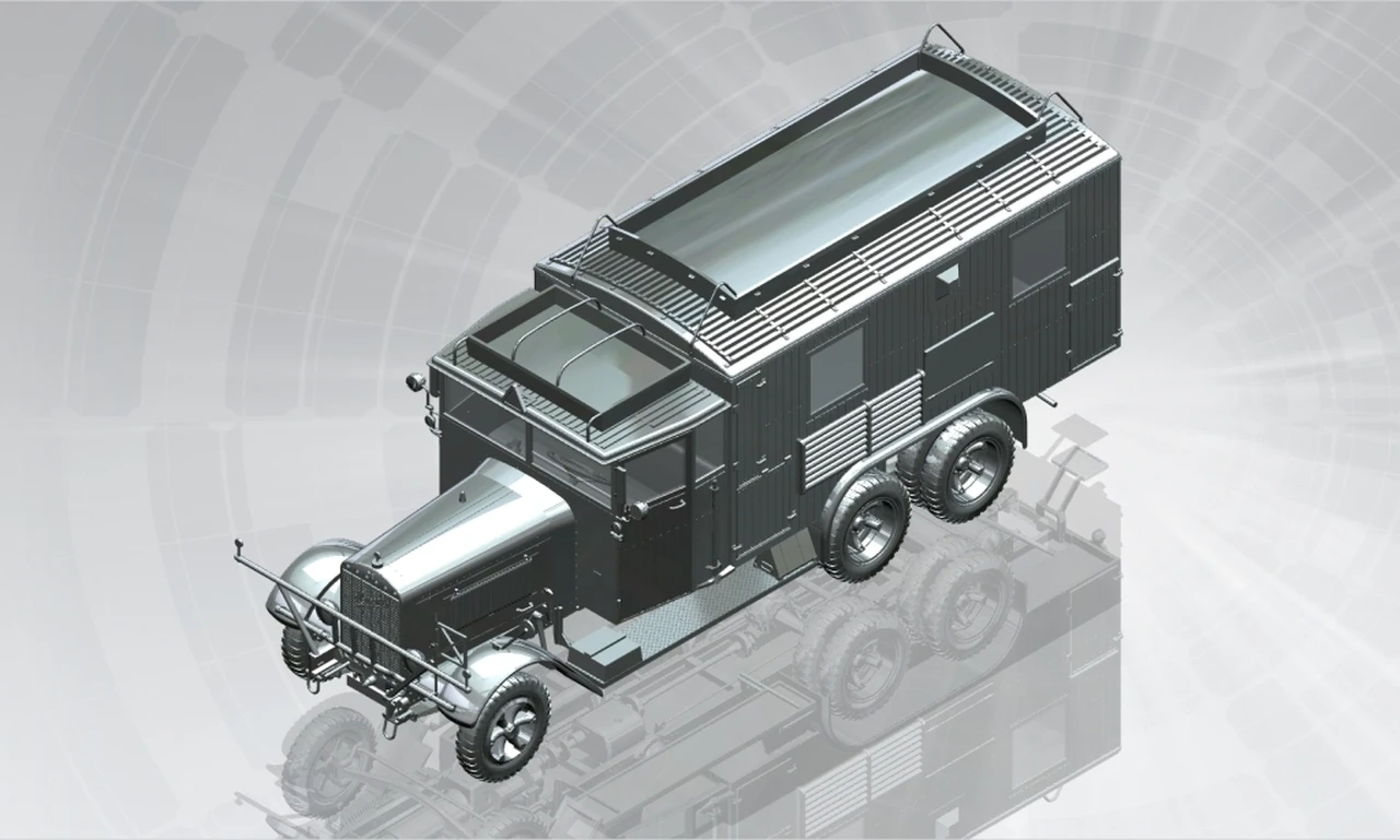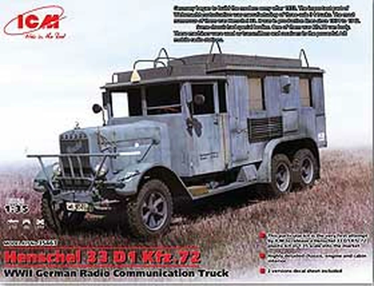 Germany began to build up their modern army after 1933. An important part of Wehrmacht motorization was the manufacturing of three-axle 3 t trucks. The most numerous of these was the Henschel 33. It was on the production lines from 1934 to 1942. The modification D1 featured a 6-cylinder petrol engine. In total about 22,000 Henschel 33 were produced. Some chassis had special bodies, including the Kfz.72 van body. These machines were used as receivers and transmitters for powerful A/B mobile radio stations.