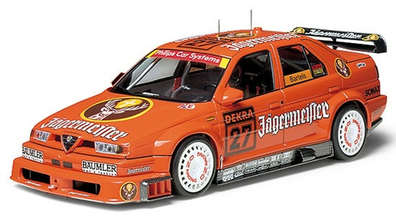 This is a classic model of the Alfa Romeo 155 V6 TI. The car made its debut in the 1993 season of the German Touring Car Championship (DTM) series, blowing the competition away in route to becoming that seasons champion. While the works team used the newest 1994 spec of the car in the next years DTM, the 1993 version was used by a number of private teams including the Schbel Engineering team. The Schbel car was adorned with the orange livery of the German liquor company called Jgermeister, and it got its German sponsor some podium time by finishing third in the final round of the season.