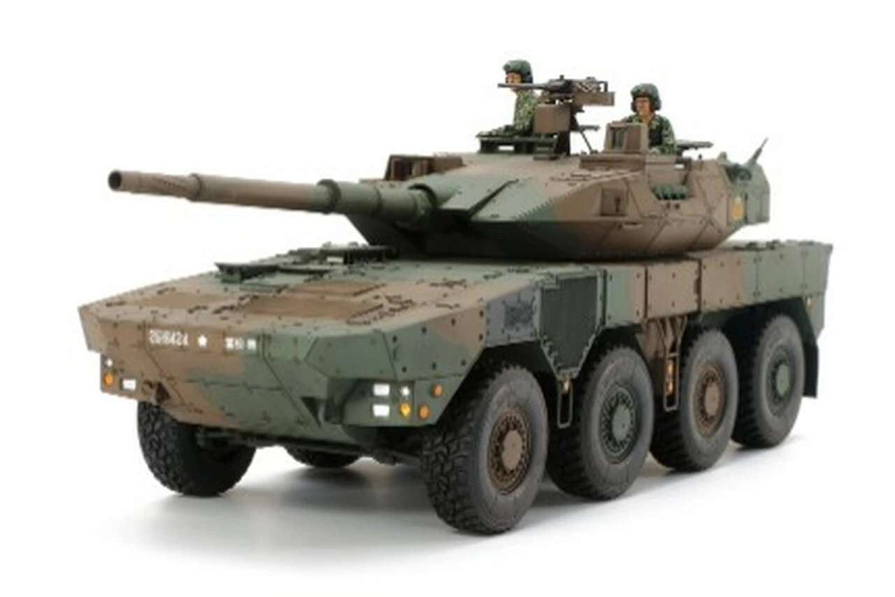 This scale model assembly kit recreates the Japan Ground Self Defense Force (JGSDF) Type 16, which reached units beginning in 2017. An 8-wheel vehicle, the JGSDF classify it as a Maneuver Combat Vehicle (MCV), a highly mobile and well-armed vehicle intended to provide supporting fire and take on enemy armor as a part of rapid response units. Its domestically designed L/52 105mm rifled gun is a low-recoil piece with perforated muzzle brake and a fire control system to enable accurate firing on the move. Rolled steel turret and hull employ modular and spaced armor estimated to be able to survive frontal hits from 20-30mm class guns and portable anti-tank weapons. Thanks to its 570hp engine, the 26-ton Type 16 has a top speed of around 100km/h and significant range; it looks set to provide a major boost to JGSDF units as its rollout continues.
