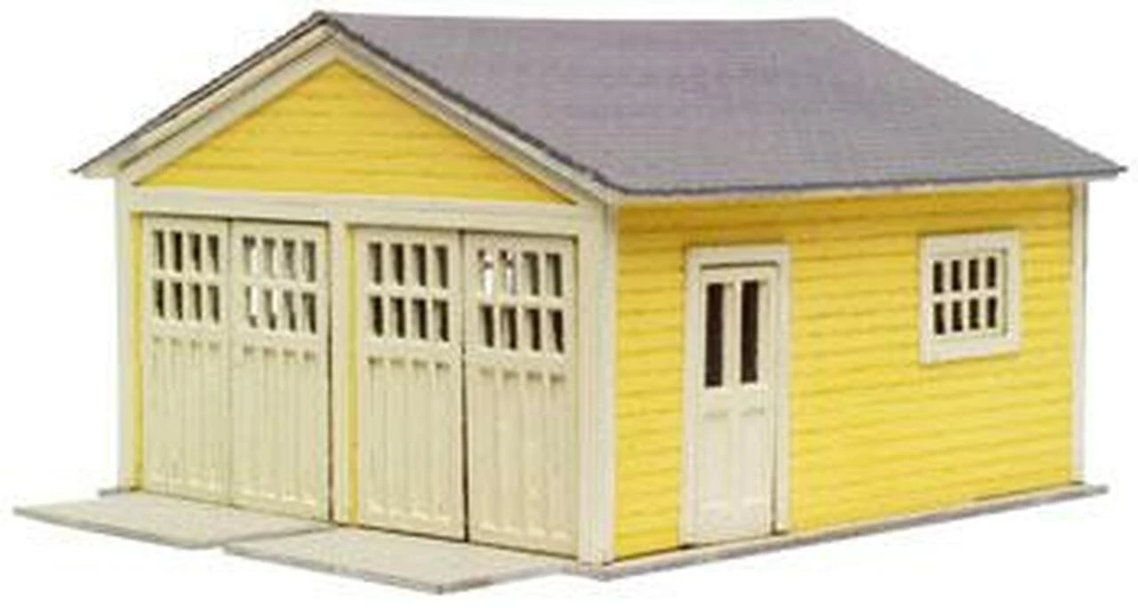 Kate’s Colonial Garage Kit is modeled after a typical two-car garage prefabricated design from the early 1920s. These inexpensive garages were built by the hundreds from prefabricated metal and wood components. Manufacturers of these garages, such as Sears Roebuck, Aladdin, and Radford Companies, often advertised that they required only basic tools for construction. Due to this ease of construction, many were actually disassembled and moved to different locations over their lifetime. This kit features several trademarks of the prototypes including the “hinged” wooden doors with multi-pane windows on top, a peaked roof and horizontal novelty siding. Each package includes 2 garage structures. Comes with a detailed instruction sheet