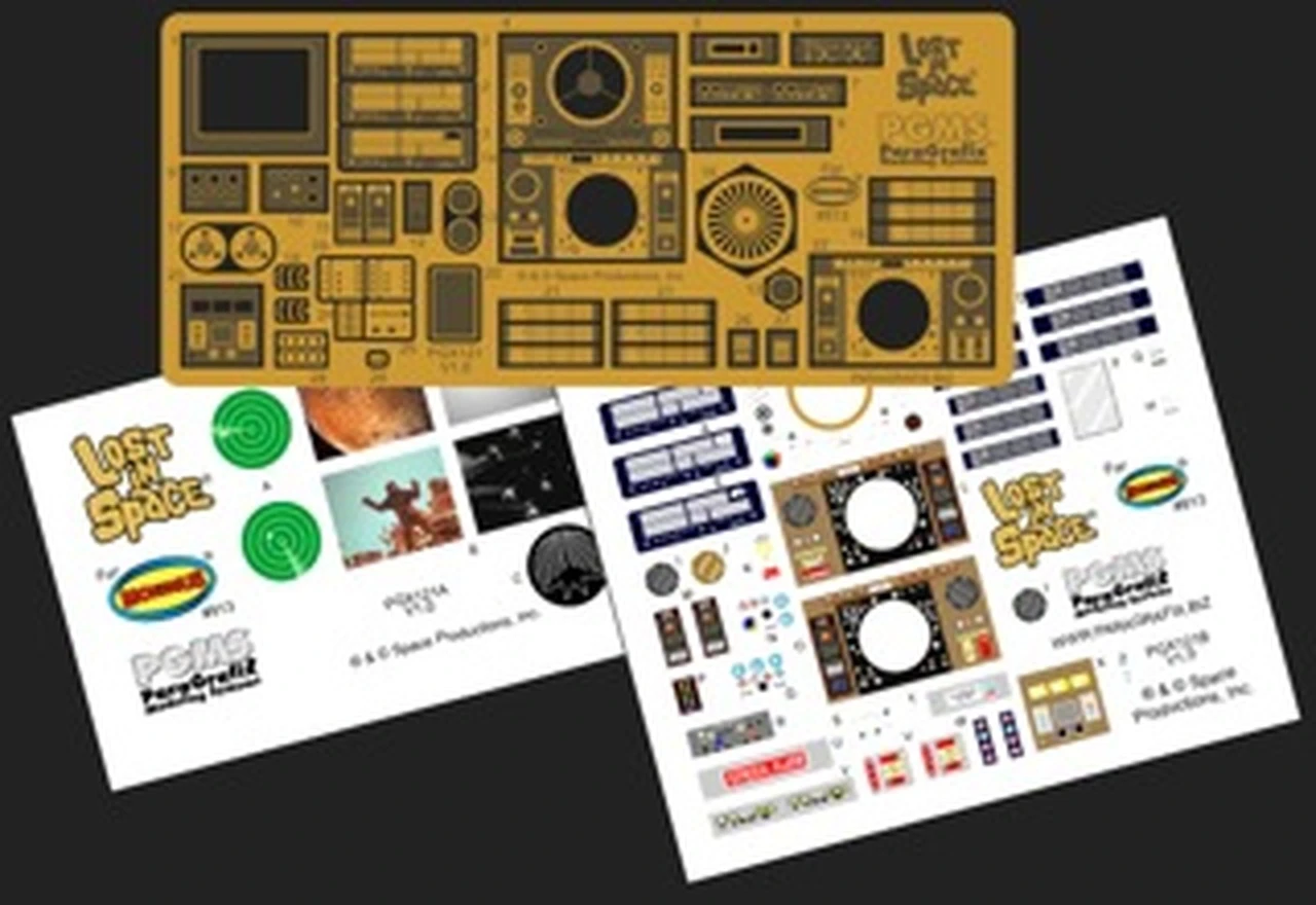 This precisely designed photoetch set is ideal for lighting. The solid brass photoetched pieces block light completely, while through-holes are provided for every light on every control panel. Includes: Photoetched panels for every control console in the ship’s interior. ALPS printed decals from JT Graphics for every button and light – no minutely detailed painting required for every button to stand out perfectly! Specially printed backlight panels for the main control consoles provide radar displays and several options of images for the communications station. Electronics not included. For Moebius Models Jupiter 2, kit 913.