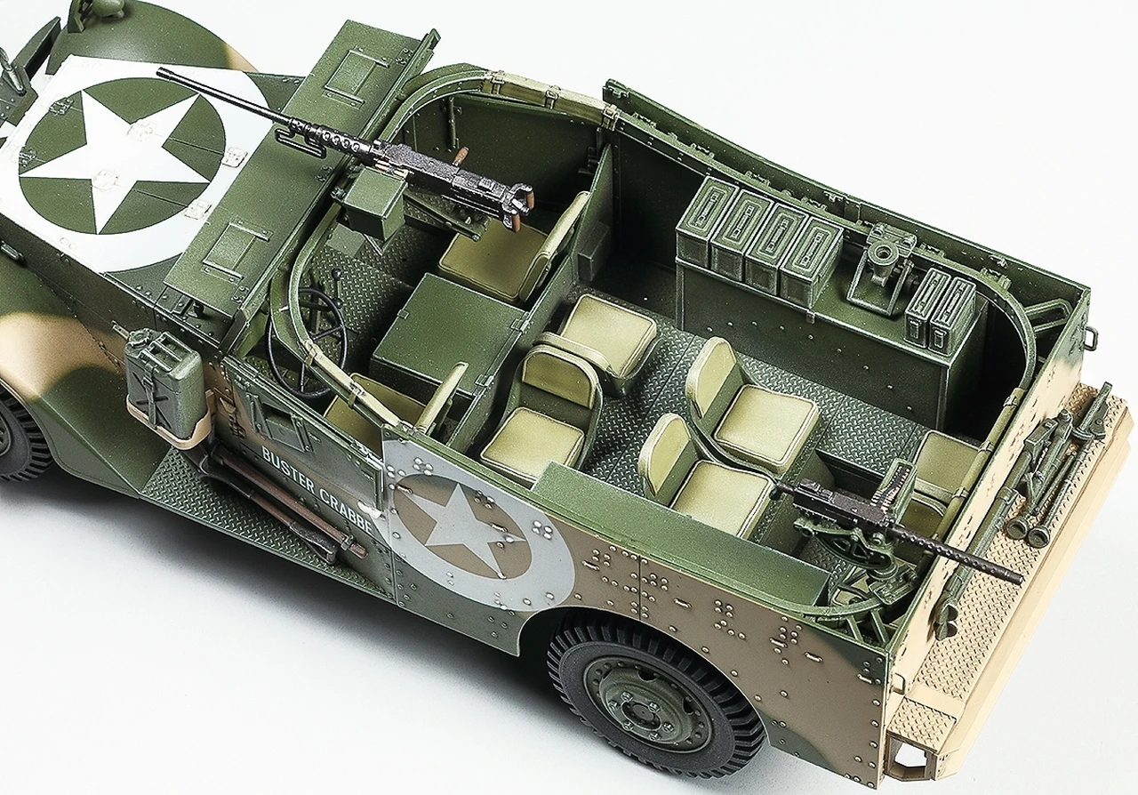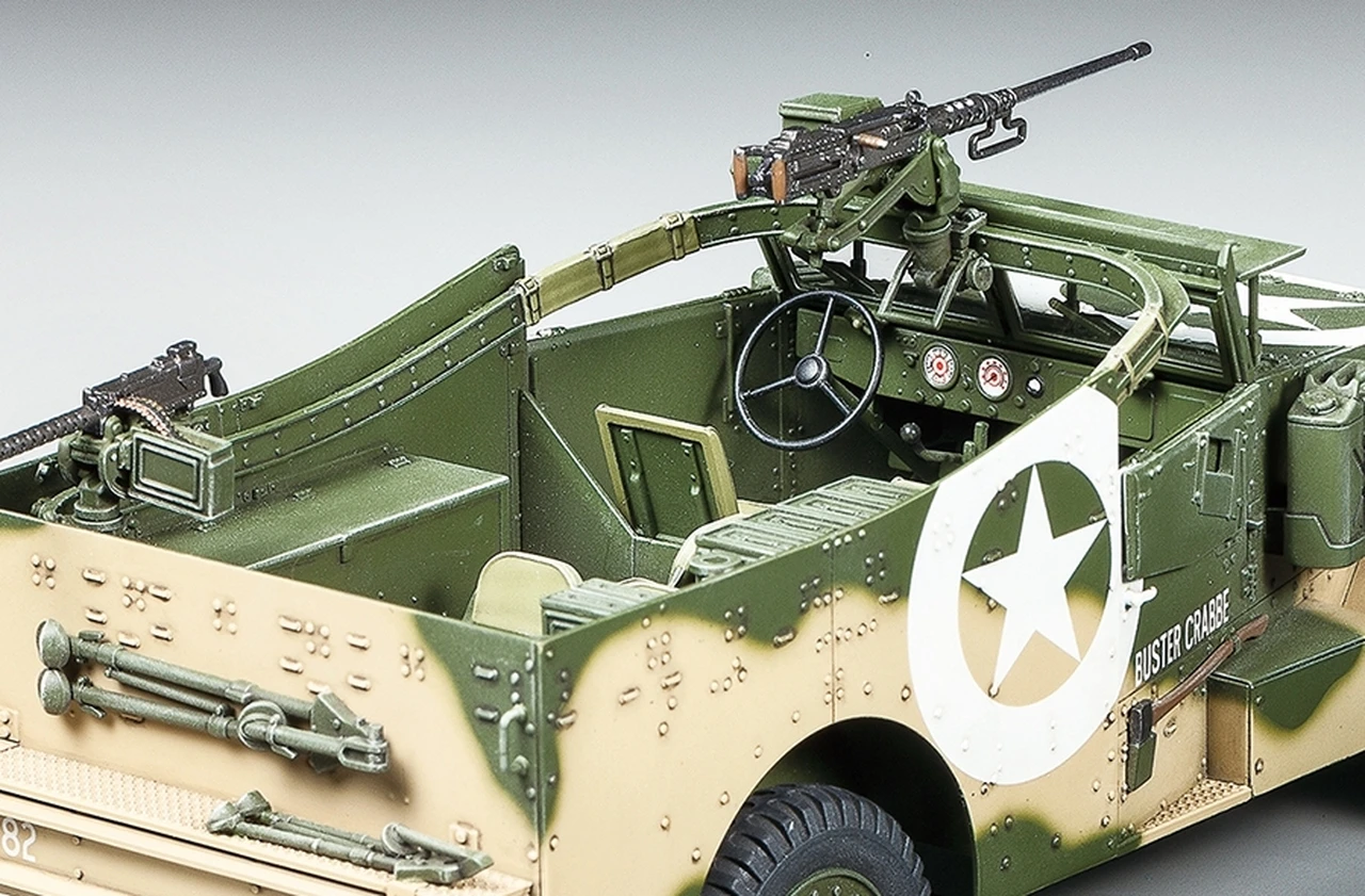 This is a scale model replica of the M3A1 Scout Car. It promises to be a great stand-alone model or make for an essential diorama piece in a bigger modeling project. Around 21,000 of the actual car were built, a vital cog in the setup of U.S. forces and those Allies (Britain, Soviet Union, Free France, China and more) who received it under lend-lease. Lightly protected with mainly 6.4mm armor, with a top road speed of 80km/h, it had one 12.7mm and two 7.62mm machine guns, could seat six in addition to a driver and commander, and was often deployed in recon and command car roles, in North Africa, Sicily, and on the Eastern Front.