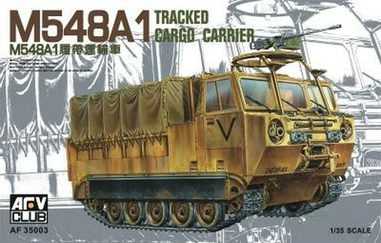 This 1/35 scale model kit of the M548A1 tracked cargo carrier by AFV Club has dozens of parts and includes waterslide decals. Paint and glue are not included in this kit and must be purchased separately.