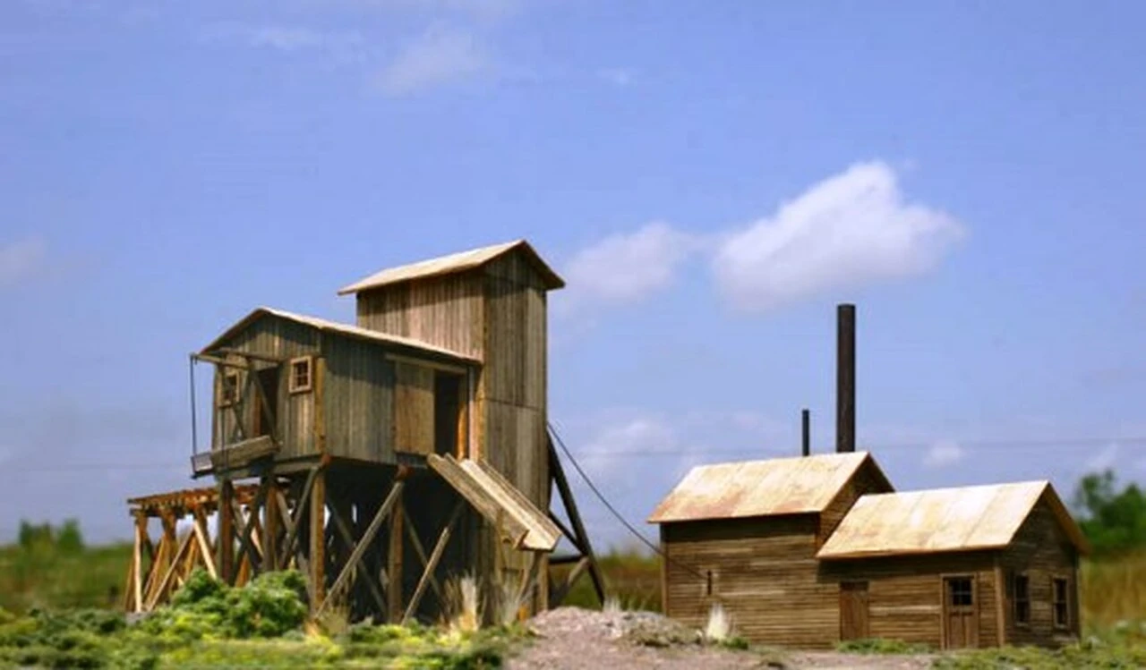 HO Scale. Includes hoist house with attached changing room, headframe with loading house and tailings trestle. Coal chutes provided for both railcar loading and truck loading. Complete mine complex measures 10″L x 9″W x 5″H.