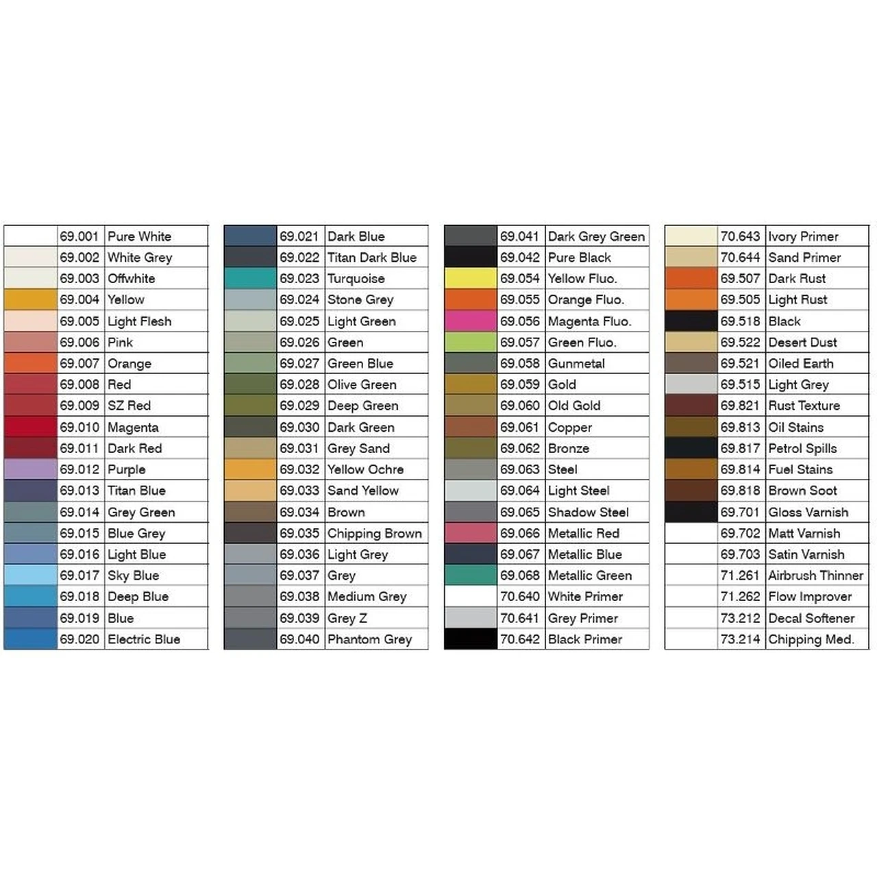 17ml bottles, The complete range of Mecha Color paints, including all 57 colors, 5 primer colors, 11 weathering colors, 3 varnishes and 4 auxiliary products.