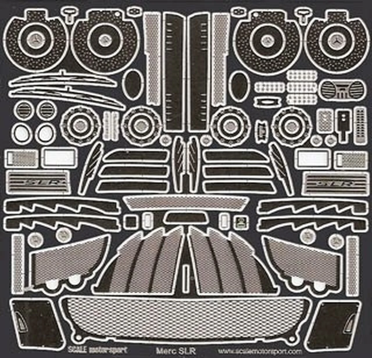 Designed for the Tamiya Mercedes-Benz SLR McLaren Tamiya kit #24290. Kit includes: Rear Brake Disc, B8 Badge, Seatbelt Clasp, Front Brake Disc, C27 Badge, Door Clasp, A4/A16 Mesh, Door Sills, Windscreen Wiper, Mirror Faces, Bolts, Dash Details, Hub Details, Reservoir Caps, Sill Badges, Radio Knobs, Radio Fascia, CD Fascia, Brake Pedal, Accelerator, Engine Details, Intake Mesh, Rim Badge, Fluid Straps
