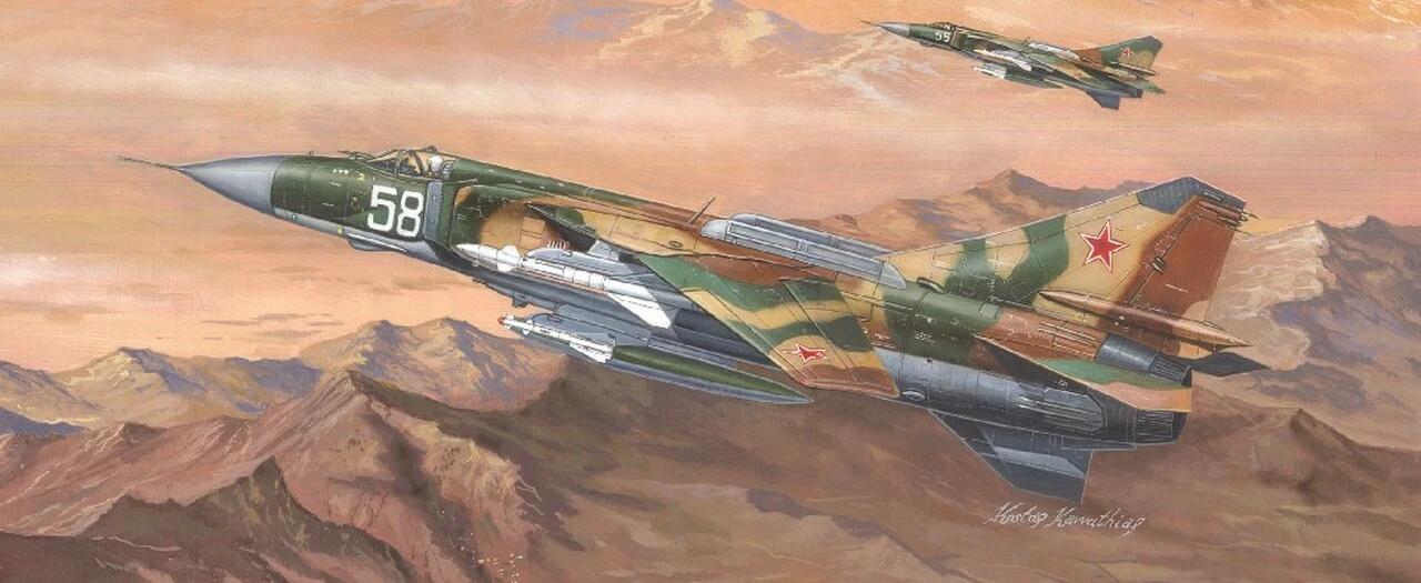 The MiG-23 was designed in 1964-66 as a successor to the MiG-21. In addition to a much more powerful engine, the MiG-23’s most significant new feature was its variable sweep wing. Like the USAF’s swing wing F-111, the sweep of the wings could be changed in flight. Fully spread, this gives a shorter takeoff/landing roll while carrying a heavier weapons load. With the wings fully swept back, the MiG-23 has greater speed. The wing has three sweep settings: 16, 45, and 72 degrees. The prototype first flew in April 1967 and MiG-23s began entering operational service in 1971. The MiG-23MLD is the most advanced version of the MiG-23 Flogger. It features a distinctive notch in the leading edge of the wing glove to improve angle of attack handling. The MiG-23 operational experience in Afghanistan prompted the modification of late production MiG-23MLDs, and these aircraft were equipped with a more sophisticated SPO-15L radar warning receiver that located more accurately the approaching direction of any hostile aircraft.