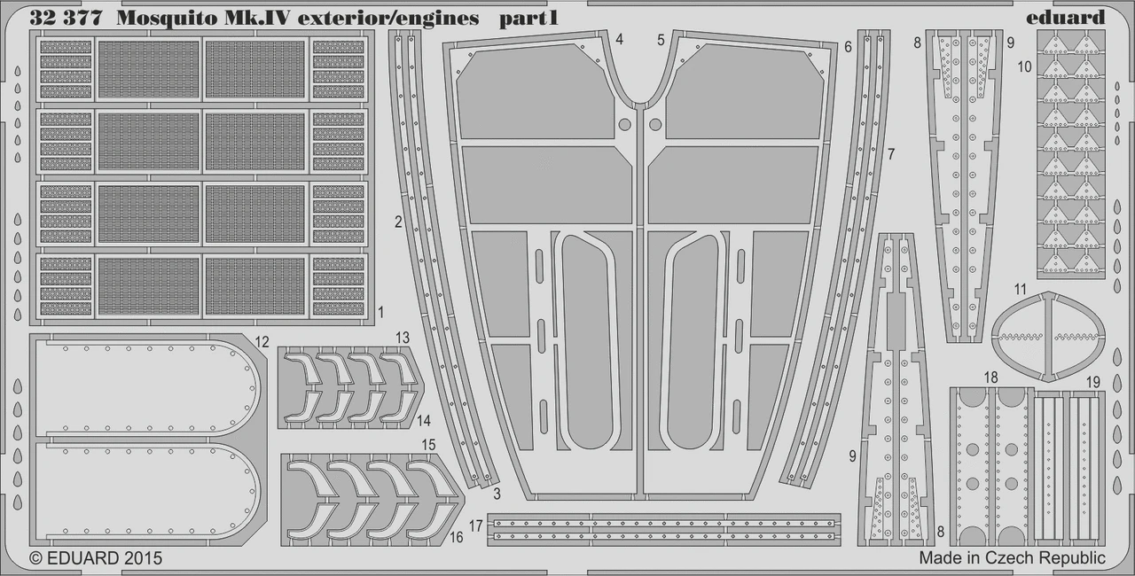 Photoetched set for HK Models’ 32nd scale Mosquito. Includes 2 sheets of parts.