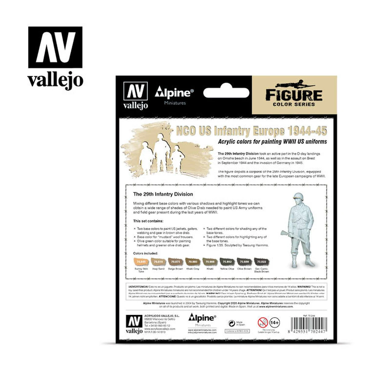 The first set of the Alpine Miniatures collection, includes a 1/35 figure which depicts a corporal of the 29th Infantry Division, equipped with the most common gear for the late European campaigns of WWII. The miniature has been sculpted by Teasung Harmms exclusively for Vallejo.