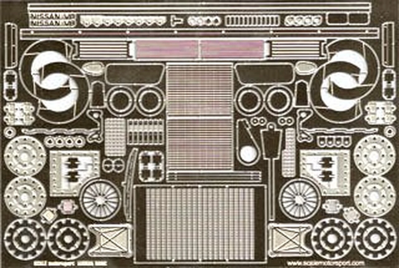 Designed For The Nissan R89C Tamiya #24093. Nickel Steel Photoetch Contains the following: Radiator Brackets, Rear Wing Wickerbil, Engine Badges, Spark Plug Boots, Front & Rear Disc Brakes, Oil Radiator Face, Roof Market Light Base, Rear Hub Details, Rear Light Backing, Window CLips, Small Radiator Facing, Kill Switch, Door Buttons, Large Radiator Facing, Body Fasteners, Tow Hook, Windscreen Wiper, Side Number Lights, Mirror Faces, Turbo Details, Rotor Details, Cam Cover Detail, Door Hinges, Exhaust Shield, Engine Mount, Hose Clamps