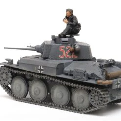 This Tamiya 1/35 scale military miniature recreates one of Germany’s formidable lightweight tanks. This subject in fact started life as a light tank developed for Czechoslovakia, but was adopted and renamed 38(t) by German forces after their occupation of the country in 1939. It was equipped with a 3.7cm main gun and could reach speeds of up to 42km/h powered by the 125hp engine. A number of variants were produced, of which the Ausf. E/F 38(t)s were manufactured over a one-year period from November 1940; they featured improved armor and were thrown into the conflict with Soviet forces after the start of Operation Barbarossa.