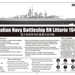 Commissioned in June 1940, RN Littorio joined the 1st Navel Squadron at Taranto under Admiral Bergamini’s flag. She was severely damaged in November 1940 while anchored at Taranto by British aircraft launched from the carrier Illustrious. In March of 1941 she was back in service and in December she participated in the first battle of Sirte Gulf. In March 1942, during the second battle of Sirte, a muzzle blast from the aft 381mm turret set fire to a Ro.43 floatplane on the fantail which led the British to believe they had scored a torpedo hit on the battleship. In June 1942 the RN Littorio was damaged by American B-24 bombers on the return to her base; she was hit by a torpedo launched by the Wellington. Repairs were completed August 1942 but the ship was to carry out no more combat missions. From December 1942 to June 1943 the RN Littorio was used to defend the cities of Taranto, La Spezia and Genoa from Allied air attacks. In July 1943 the RN Littorio was renamed the Italia. She was decommissioned in June 1948 after a total of 46 missions, nine of which were combat missions.