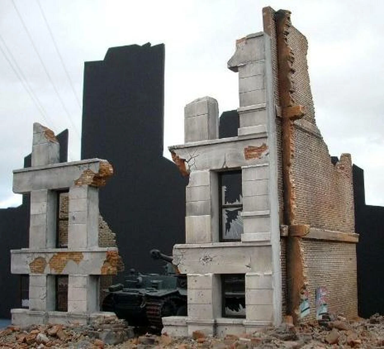1/35 Scale kit features four beautifully detailed hydrocal plaster castings, laser cut wood windows and shattered glass, posters, cast rubble piles and bricks and full color, easy to understand painting and aging instructions. Very simple construction. 12″ x 9″ x 12″ tall. Base, tank or figures not included