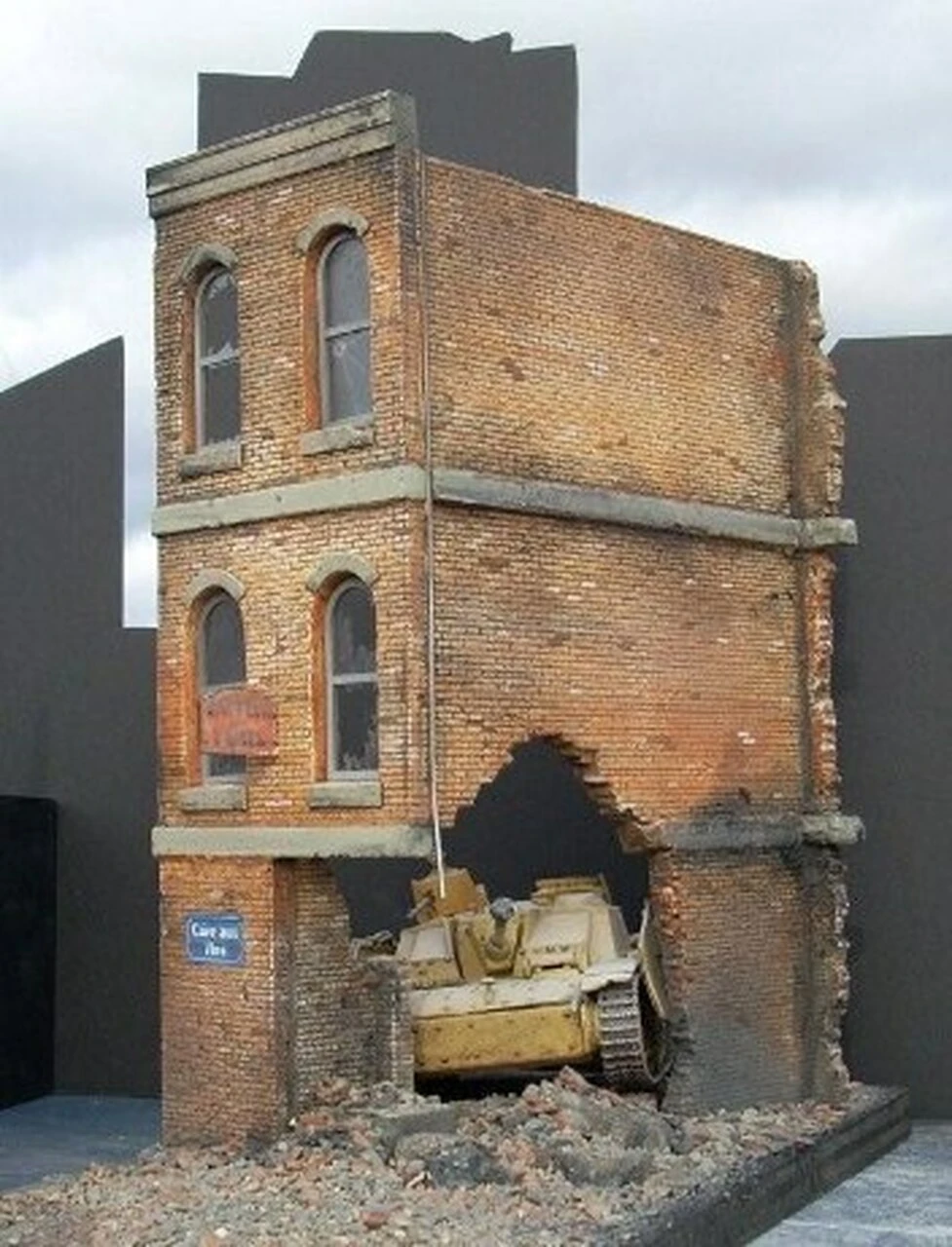 1/35 Scale kit features three beautifully detailed hydrocal plaster castings, laser cut wood windows and shattered glass, signs, cast rubble piles and bricks and full color, easy to understand painting and aging instructions. Very simple construction. 8 1/2″ x 4 1/2″ x 12″ tall. Base, tank or figures not included
