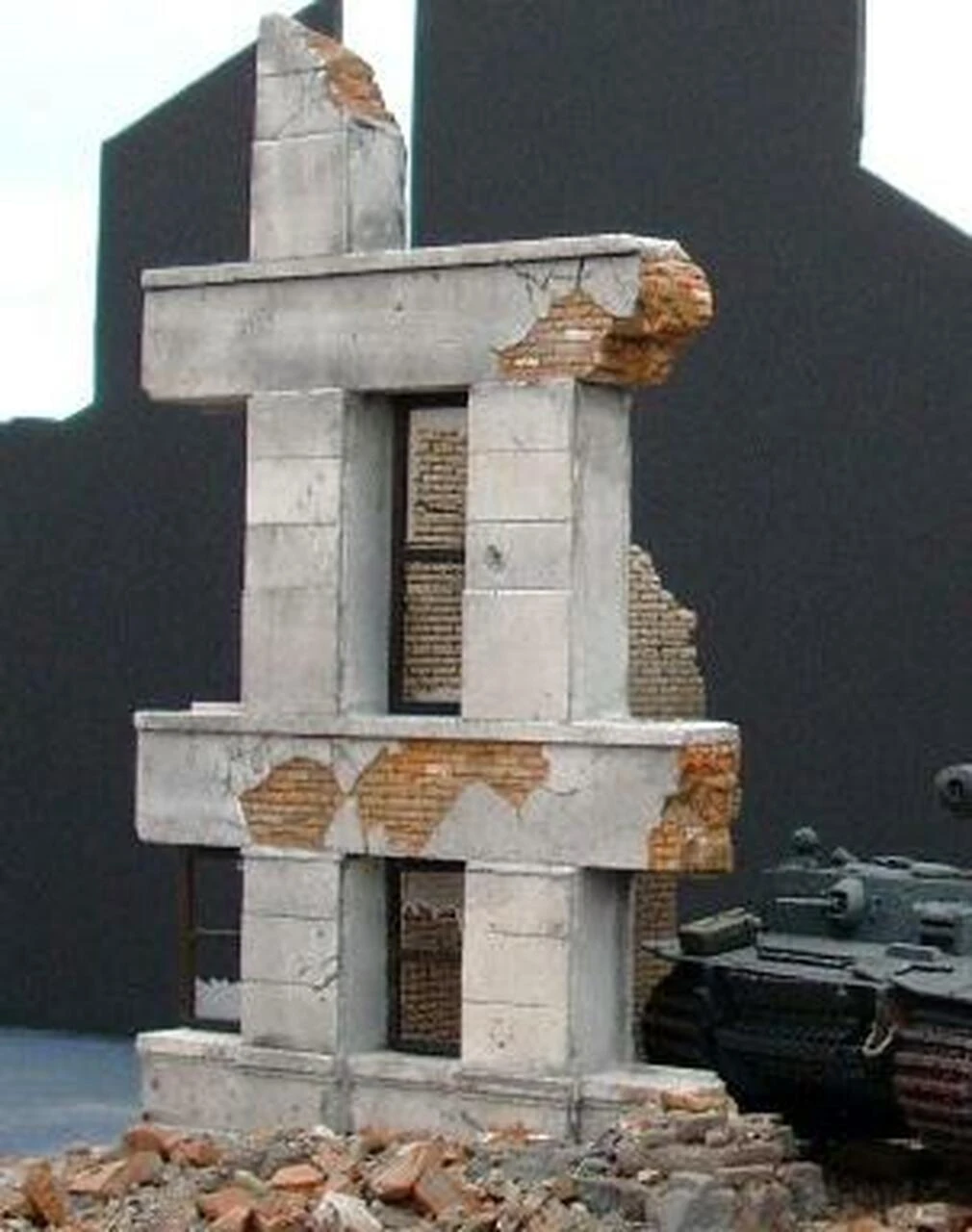 1/35 Scale kit features two beautifully detailed hydrocal plaster castings, laser cut wood windows and shattered glass, cast rubble piles and bricks and full color, easy to understand painting and aging instructions. Very simple construction. This building can be basically glued together and ready to paint and detail in about 15 minutes. 6″ x 6″ x 8″ tall. Base, tank or figures not included