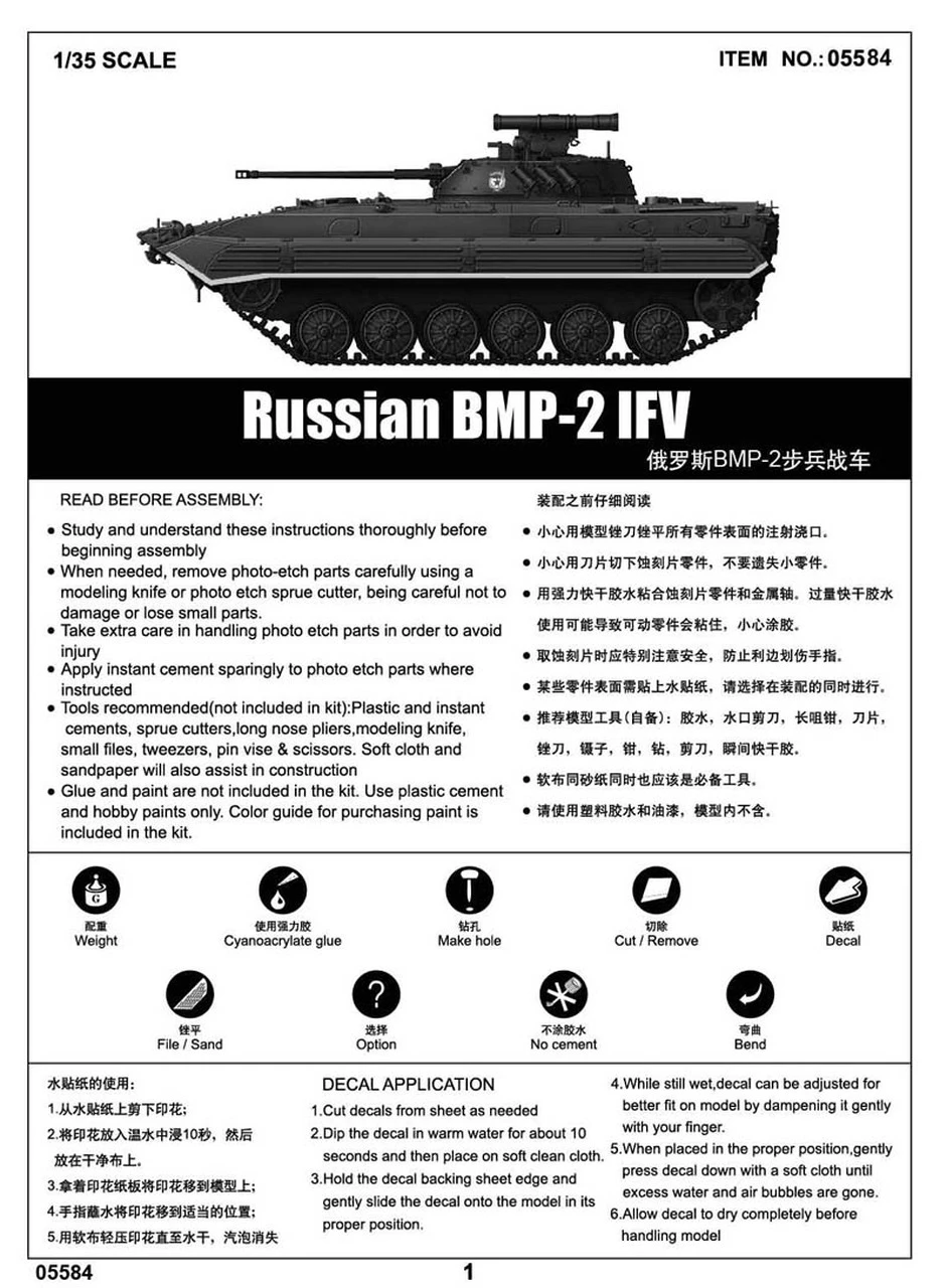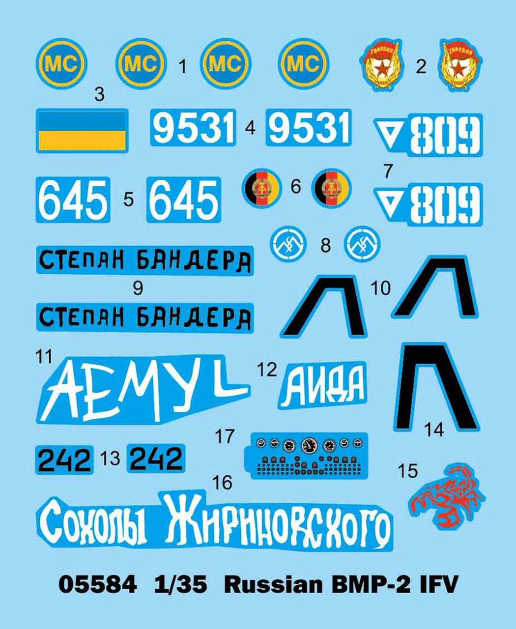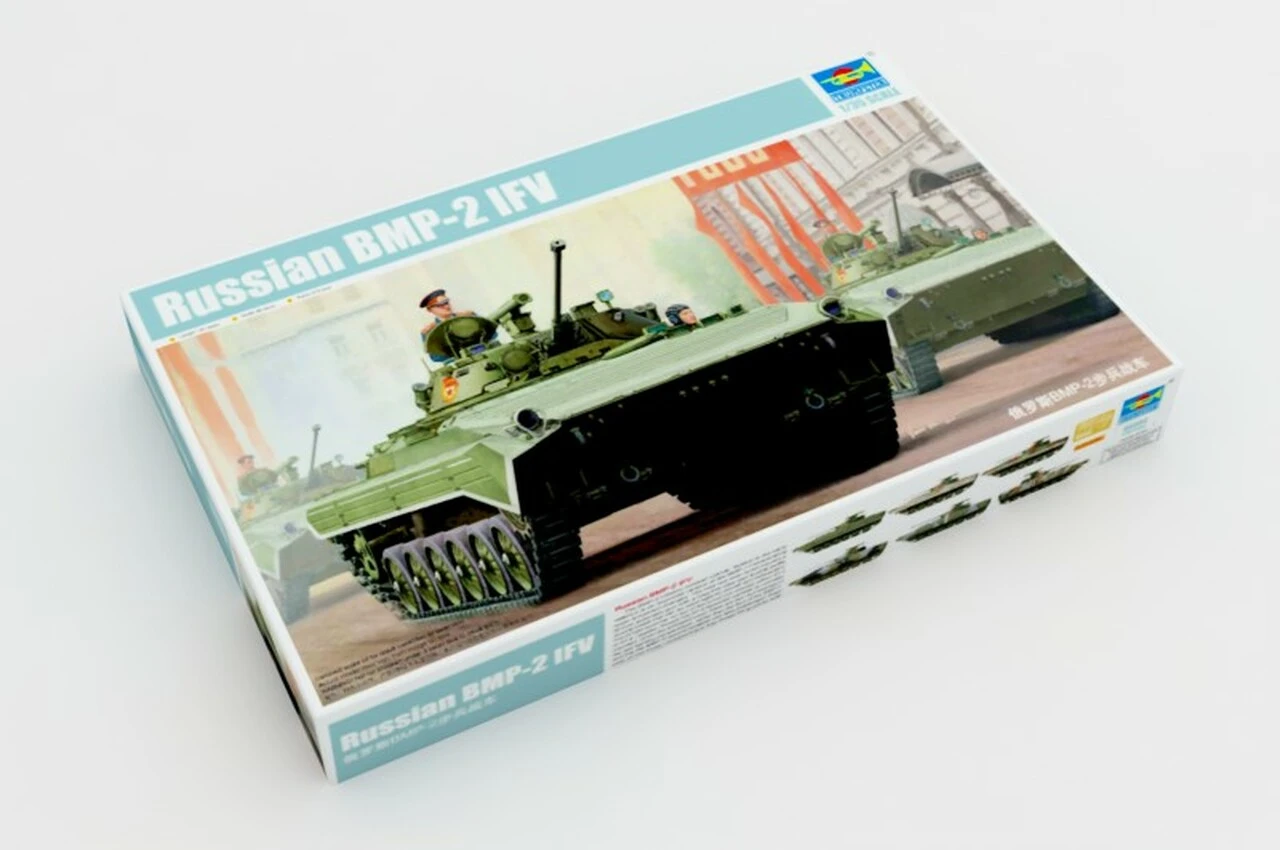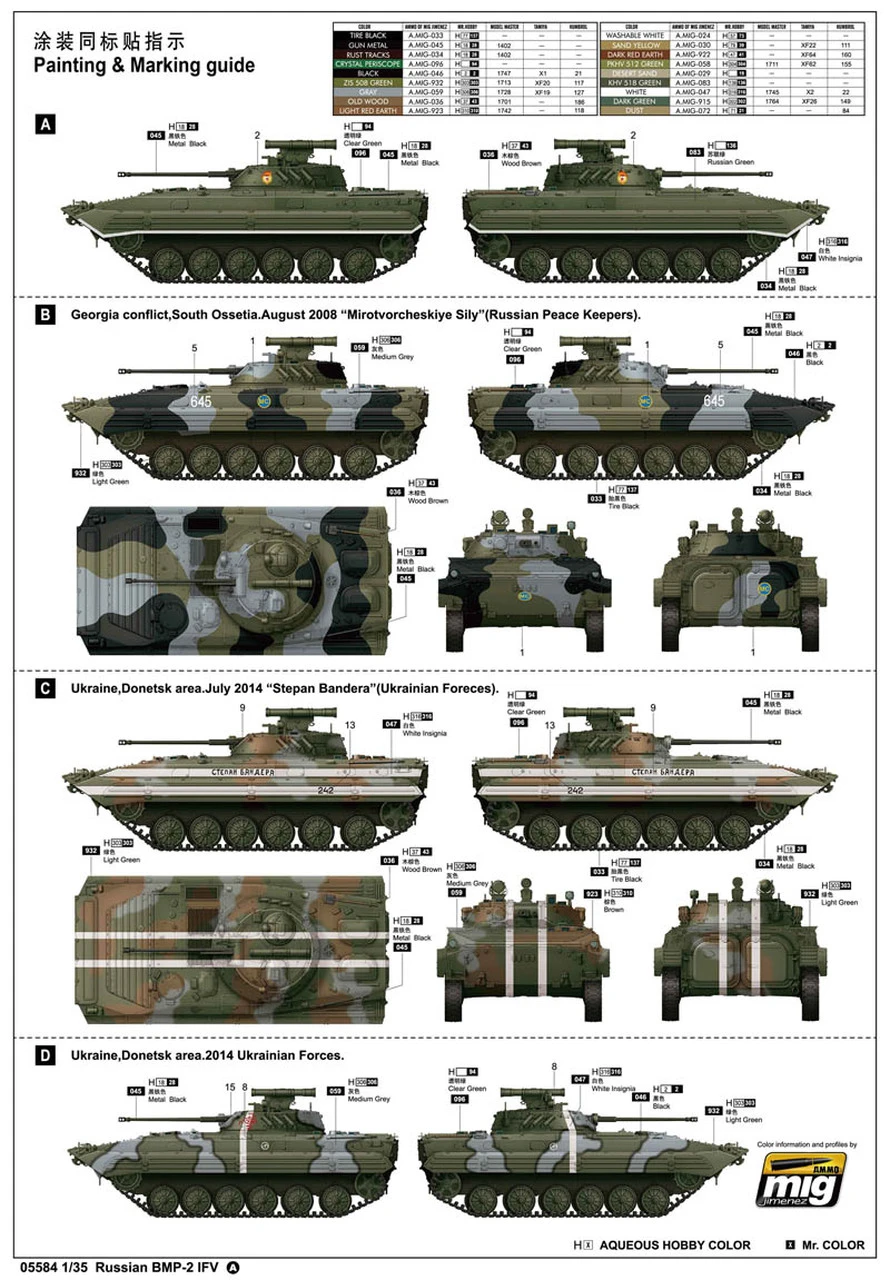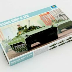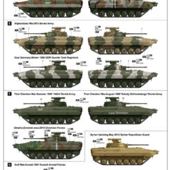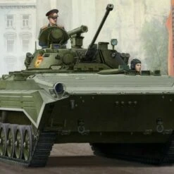 The BMP-2 infantry combat vehicle, fielded in the early 1980’s, is an improved version of the BMP-1 incorporating major armament changes. The new two-man turret mounts a 30mm automatic gun with a long thin tube and double-baffle muzzle brake that can be used against aircraft and helicopters. The ATGM launcher on top of the turret can employ either AT-4 or AT-5 missiles, though the AT-5 Spandrel canister is most normally mounted. Given the enlarged turret, there are two roof hatches in the rear fighting compartment, rather than the four of the BMP-1, and the BMP-2 accommodates one less passenger. Each side of the troop compartment has three firing ports with associated roof-mounted periscopes.