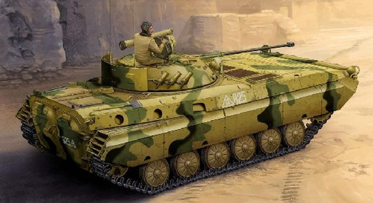 The BMP-2 infantry combat vehicle, fielded in the early 1980’s, is an improved version of the BMP-1 incorporating major armament changes. The new two-man turret mounts a 30mm automatic gun with a long thin tube and double-baffle muzzle brake that can be used against aircraft and helicopters. The ATGM launcher on top of the turret can employ either AT-4 or AT-5 missiles, though the AT-5 Spandrel canister is most normally mounted. Given the enlarged turret, there are two roof hatches in the rear fighting compartment, rather than the four of the BMP-1, and the BMP-2 accommodates one less passenger. Each side of the troop compartment has three firing ports with associated roof-mounted periscopes.
