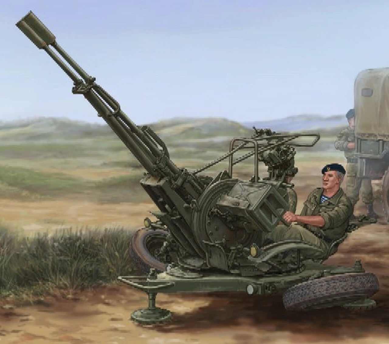 The ZU-23-2 (Zenitnaya Ustanovka) is a towed Soviet short-range air defense cannon introduced in the 1960s. It mounts two 23mm cannons on a small trailer which can be converted into a stationary mount for firing the guns. ZU-23-2 can be towed by a number of different vehicles. In the USSR and later Russia, the most frequently used towing vehicles for it were GAZ-66 4 x 4 trucks and GAZ-69 4 x 4 light trucks.