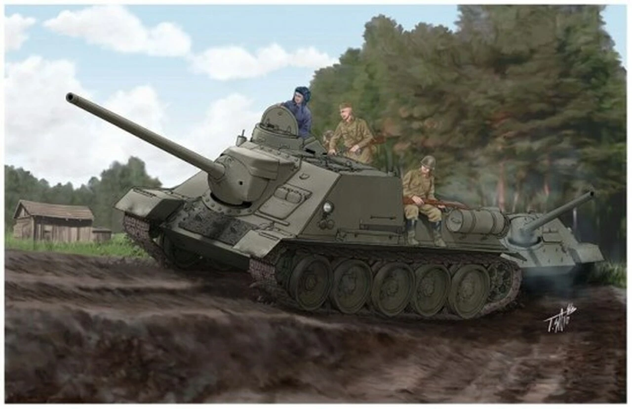 The SU-100 tank destroyer was developed in 1944 as an improvement to the SU-85. It was built on the same chassis as the T-34/85 tank at the UZTM in Yekaterinburg. The SU-100 quickly proved itself to be among the best self-propelled anti-tank guns of World War II, able to penetrate 125mm of vertical armor from a range of 2000m and the sloped 85mm front armor of the German Panther from 1500m. After intensive testing, Soviet engineers approved the D-10S gun for mass production. The hull of the SU-100 had major improvements over the SU-85: the thickness of the front armor was increased from 45 to 75mm and the commander’s workplace was made in a small sponson on the right side of the hull; combined with the commander’s cupola this greatly improved the commander’s effectiveness. Two ventilator units were installed instead of only one as in the SU-85. Mass production began in September 1944.