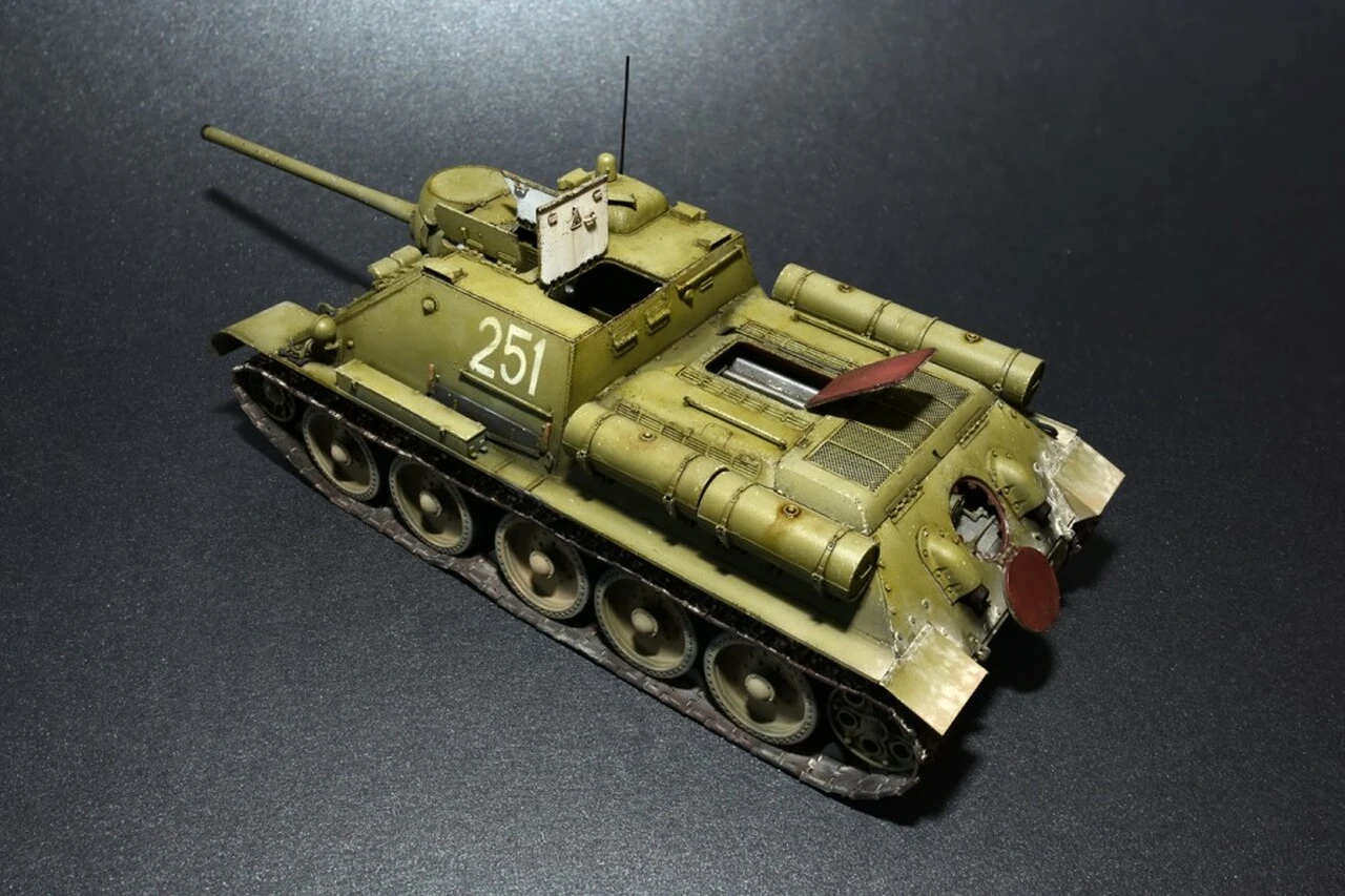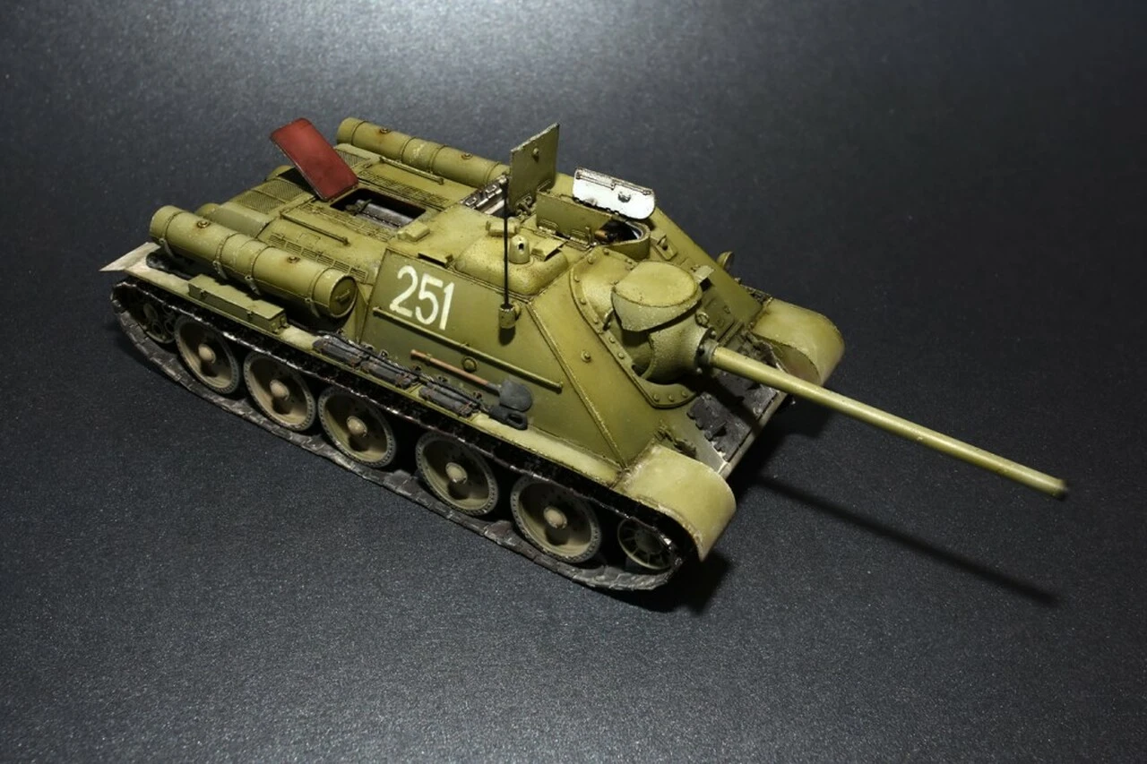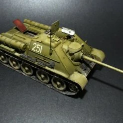 The SU-85 (Samokhodnaya ustanovka 85) was a Soviet self-propelled gun used during World War II, developed on the basis of the T-34 medium tank and the SU-122 assault gun. Produced from August 1943 through July 1944, the 85mm D-5S gun allowed the SU-85 to effectively hit enemy medium tanks at distances of more than 1000 meters and was able to destroy a Tiger tank from 1000 meters out, proving much capable against the newer German tank designs.