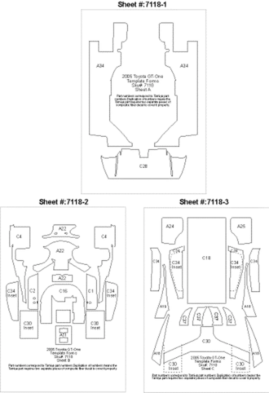 Designed for the Tamiya Toyota GT-One kit #24222. The Toyota Template cf set contains three sheets, one each of 1024, 1020 and 1220 containing 30 template parts precisely matched to the corresponding Tamiya part numbers.