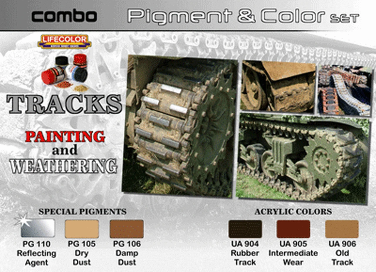 This set is dedicated to paint the tracks of armoured tracked vehicles. The set contains 3 pots of powder pigments and 3 acrylic colours to paint the tracks. The Pigments and the colours have been developed to create realistic and harmonious effects. This set includes: PG 110 Reflecting Agent, PG 105 Dry Rust, PG 106 Damp Rust, UA 904 Rubber Track, UA 905 Track Intermediate Wear, UA 906 Old Track.