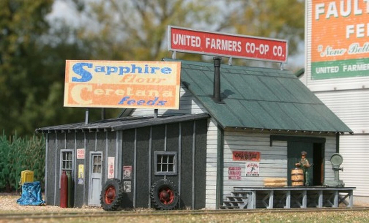 Although not based on any specific prototype, our laser-cut wood kit reflects the spirit of these farmer co-ops, so prevalent in the hundreds of small towns dotting the breadbasket region of the country. A great companion piece to our Kit No. 193 Country Elevator, this structure is right at home trackside providing a warehouse for supplies received by rail as well as offering a truck loading dock, store front, gas pump, and an attached repair shed, where tractor and implement repairs and welding services could be procured. Topped off with colorful billboard signage, the Farmers Co-op features AMBs usual tab and slot wall construction; peel and stick windows/doors/trim; rafter tails; dock height floor; laser-cut tarpaper, battens, and roofing materials; and an assortment of custom white metal and cast resin detail parts.